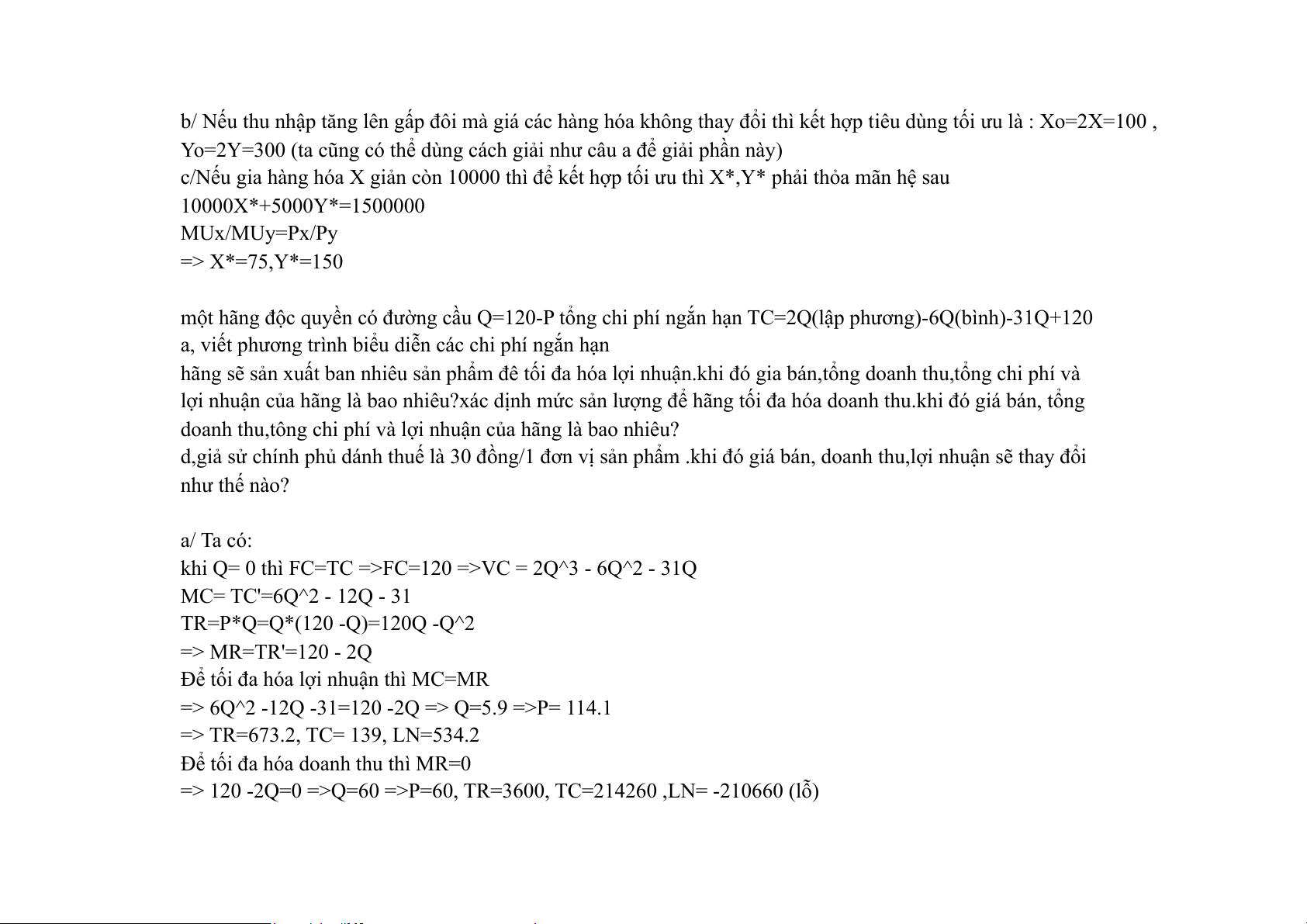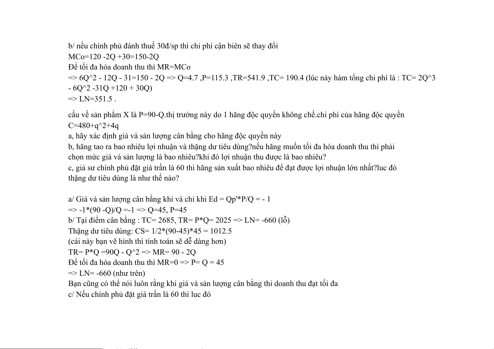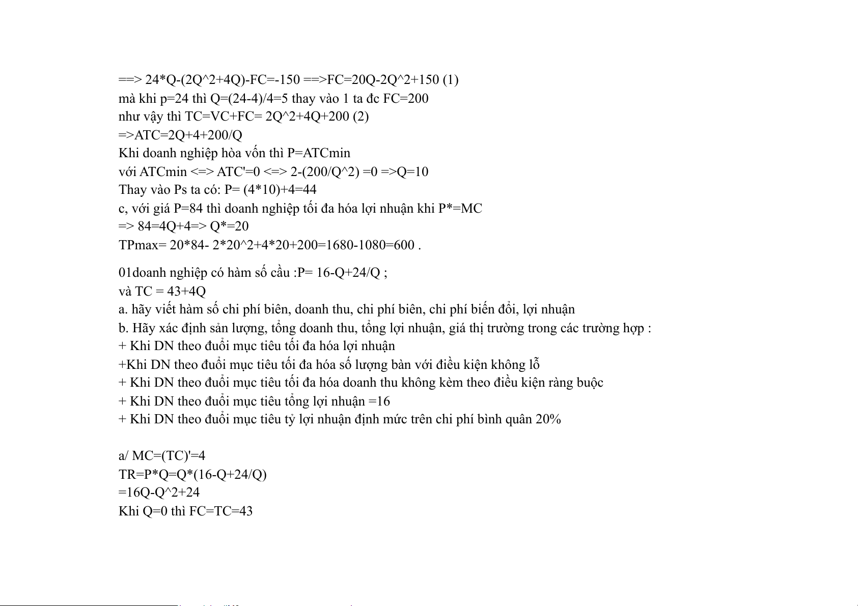 => 6Q^2 - 12Q - 31=150 - 2Q => Q=4.7 ,P=115.3 ,TR=541.9 ,TC= 190.4 (lúc này hàm tổng chi phí là : TC= 2Q^3 - 6Q^2 -31Q +120 + 30Q) => LN=351.5 .