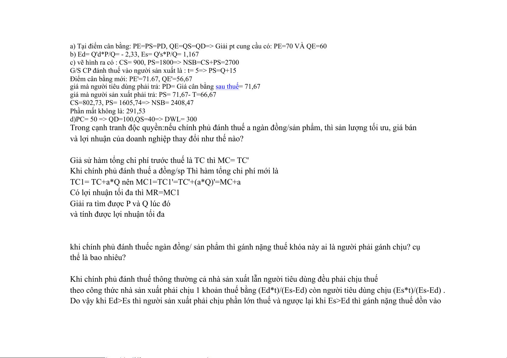 d,giả sử chính phủ dánh thuế là 30 đồng/1 đơn vị sản phẩm .khi đó giá bán, doanh thu,lợi nhuận sẽ thay đổi như thế nào? a/ Ta có: