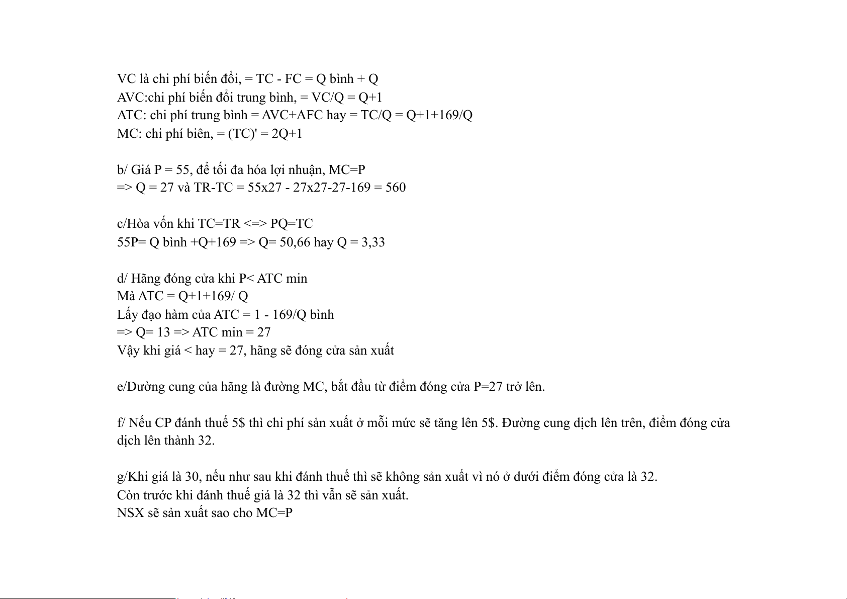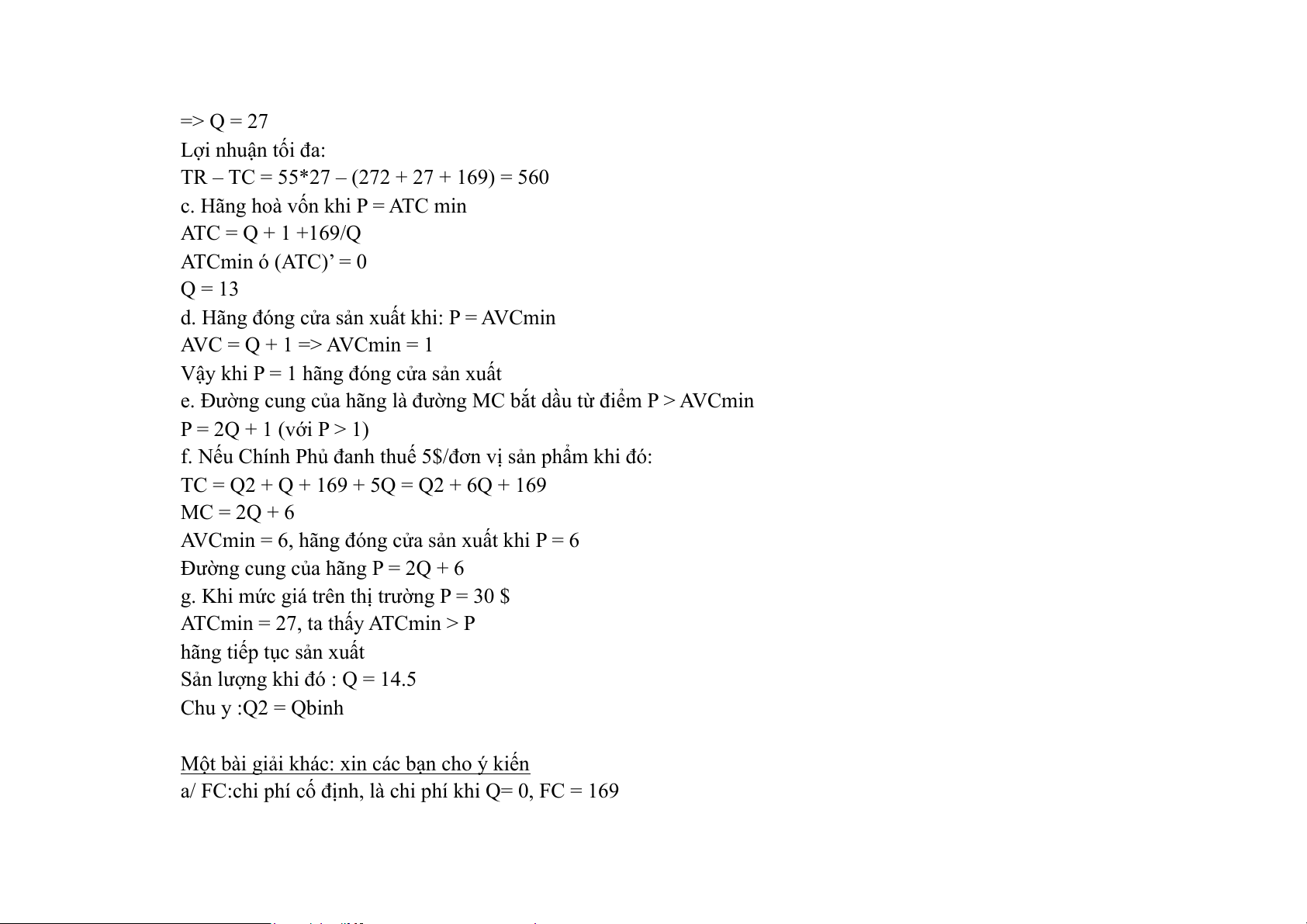 g. khi mức giá trên thi trường là 30$ thì hàng có tiếp tục sản xuất ko và sản lượng là bao nhiêu? a. FC = TCq=0 = 169 VC = TC – FC = Q2 + Q AVC = TC/Q = Q + 1 + 169/Q MC = (TC)’ = 2Q + 1 b. Khi P = 55 $