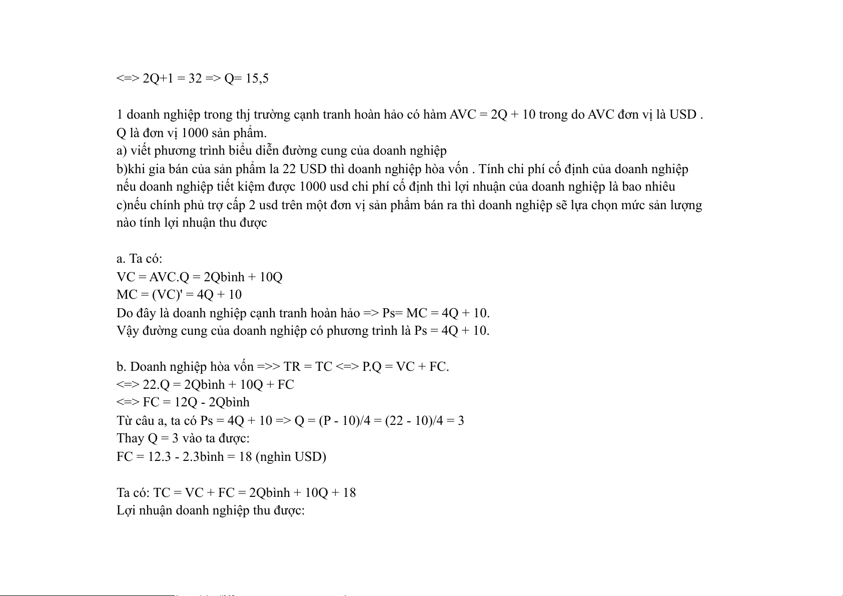 1 doanh nghiệp trong thj trường cạnh tranh hoàn hảo có hàm AVC = 2Q + 10 trong do AVC đơn vị là USD .