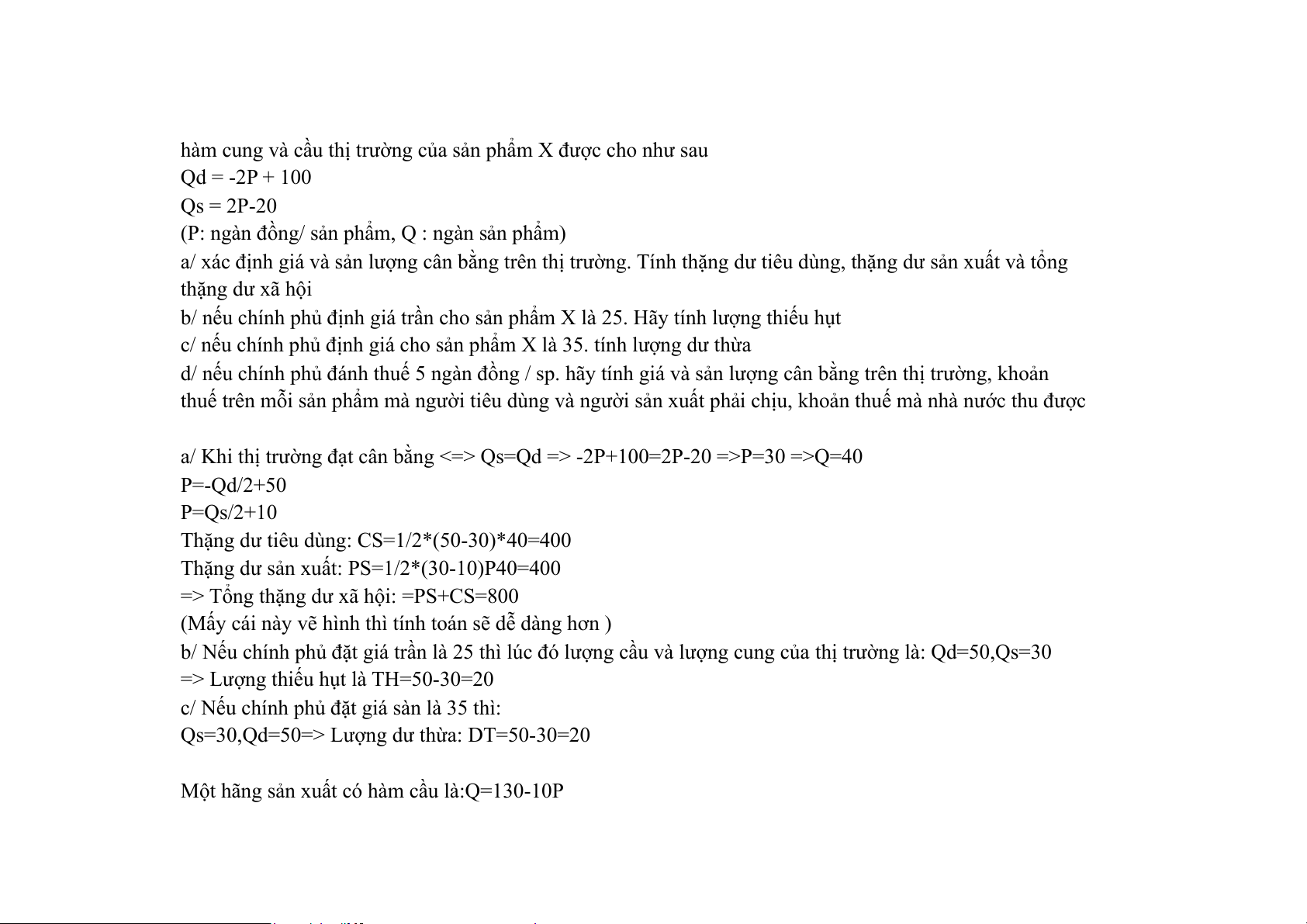 thị trường sản phẩm A coi là canh tranh hàm cầu và hàm cung được cho bởi sau đây: Pd=100-Q Ps=10+Q