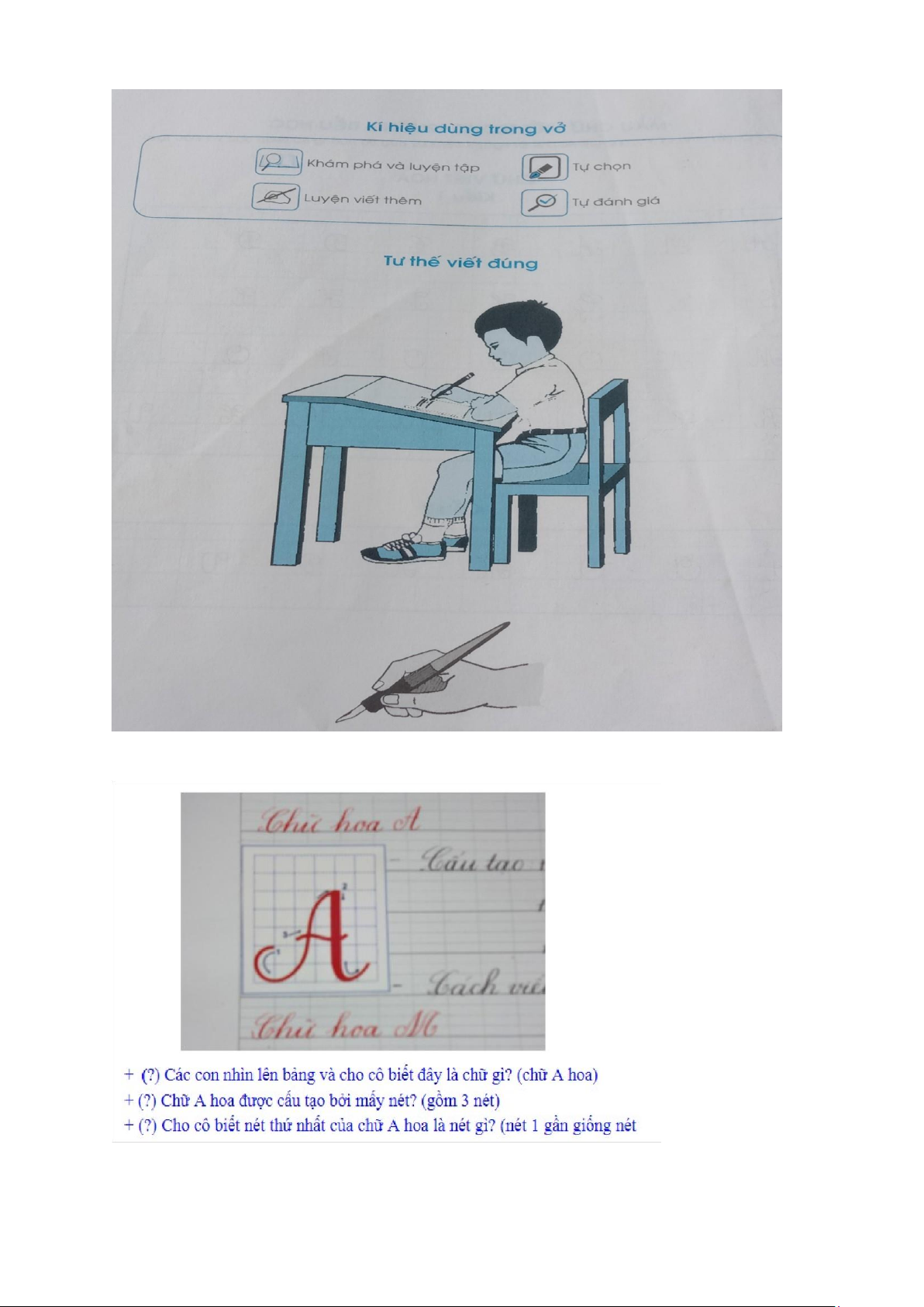thêm về từ và cụm từ. Ví dụ ở tuần 1, học sinh viết hoa chữ A, sau đó viết thêm từ