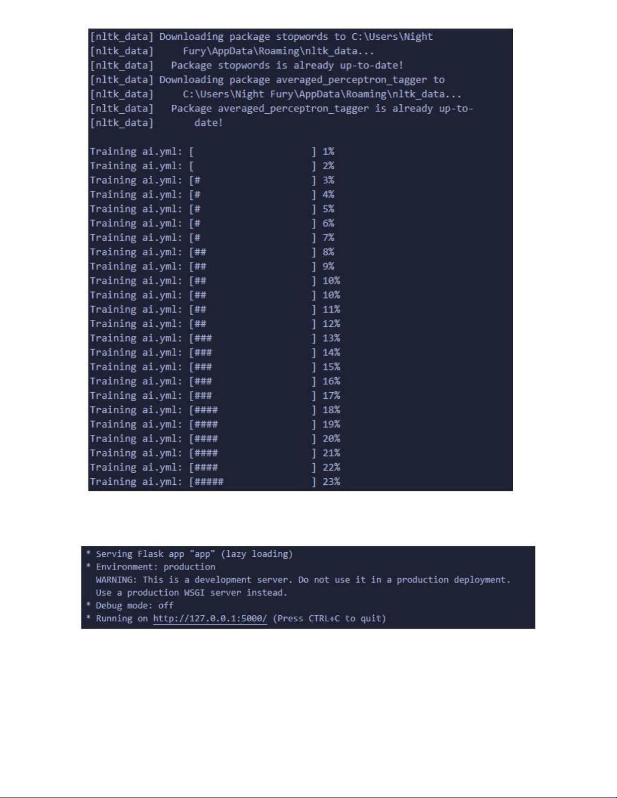 Sau khi chạy file chatbot sẽ huấn luyện dữ liệu từ kho dữ
