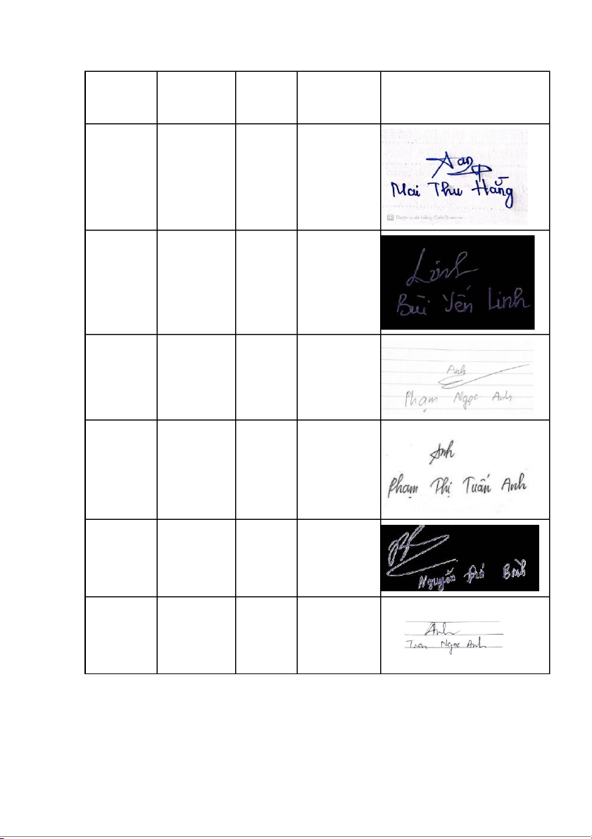 viên Nội dung Mức độ đóng Chữ ký viên góp Mai Thu 1.1, 1.3, 1.5 Hằng 24A4011582 Word + ( NT ) Slide Bùi Linh Yến 24A4012308 1.2+1.4 + Slide Phạm Anh Ngọc 23A4010055 2.2 + Word Phạm Thị Tuấn Anh 24A4012680 2.1 và 2.3 Nguyễn Đức Bình 22A4010117 2.2 + slide Trần