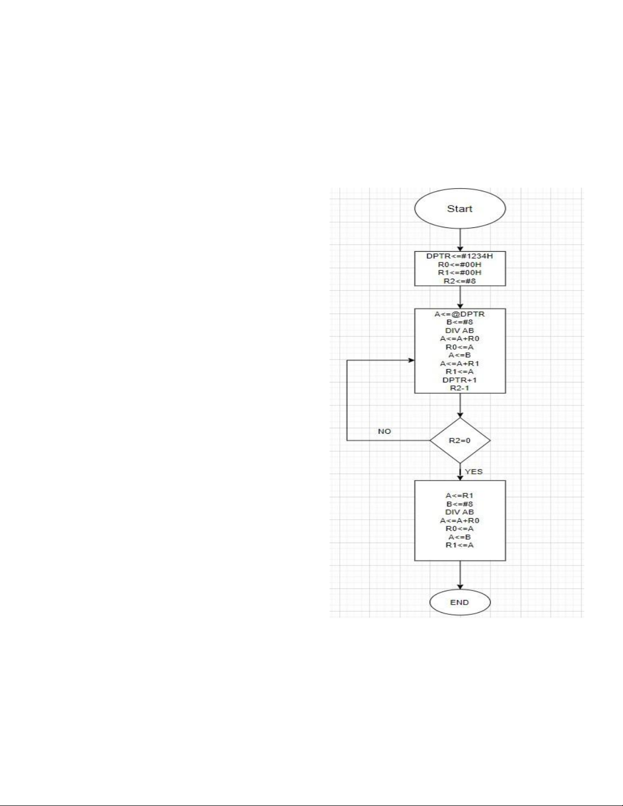Thương được lưu trữ trong R0 số dư được lưu trữ trong R1. ORG 30H lOMoAR cPSD| 61554479 MOV DPTR,#1234H MOV R0,#00H MOV R1,#00H MOV R2,#8 Lap: MOVX A,@DPTR MOV B,#8 DIV AB ADD A,R0 MOV R0,A MOV A,B ADD A,R1 MOV R1,A INC DPTR DJNZ R2,Lap MOV A,R1 MOV B,#8 DIV AB ADD A,R0 MOV R0,A MOV A,B lOMoAR cPSD| 61554479