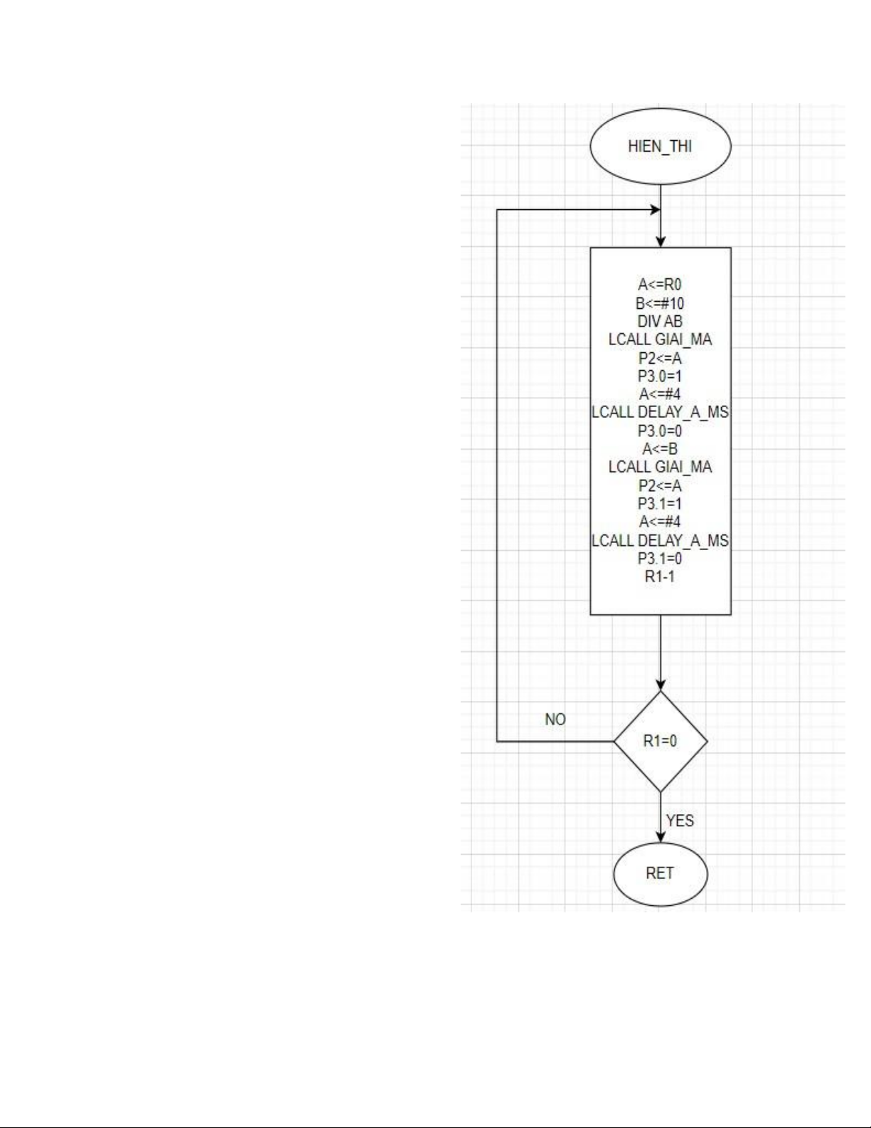 Sử dụng Port2 của VĐK làm port dữ liệu, và 2 chân P3.0 và P3.1 điều khiển quét LED. lOMoAR cPSD| 61554479 ORG 0000H MAIN: MOV R0,#20 DEM_LUI: MOV R1,#125 LCALL HIEN_THI DJNZ R0,DEM_LUI SJMP MAIN HIEN_THI: MOV A,R0 MOV B,#10 DIV AB LCALL GIAI_MA lOMoAR cPSD| 61554479 MOV P2,A SETB P3.0 MOV A,#4 LCALL DELAY_A_MS CLR P3.0 MOV A,B LCALL GIAI_MA MOV P2,A SETB P3.1 MOV A,#ON LCALL DELAY_A_MS CLR P3.1 DJNZ R1,HIEN_THI RET DELAY_A_MS: MOV TMOD,#01H LOOP: CLR TF0 MOV TH0,#0FCH MOV TL0,#18H SETB TR0 WAIT: JNB TF0,WAIT CLR TR0 DJNZ 0E0H,LOOP lOMoAR cPSD| 61554479 RET GIAI_MA: MOV DPTR,#MA_SO MOVC A,@A+DPTR RET MA_SO: