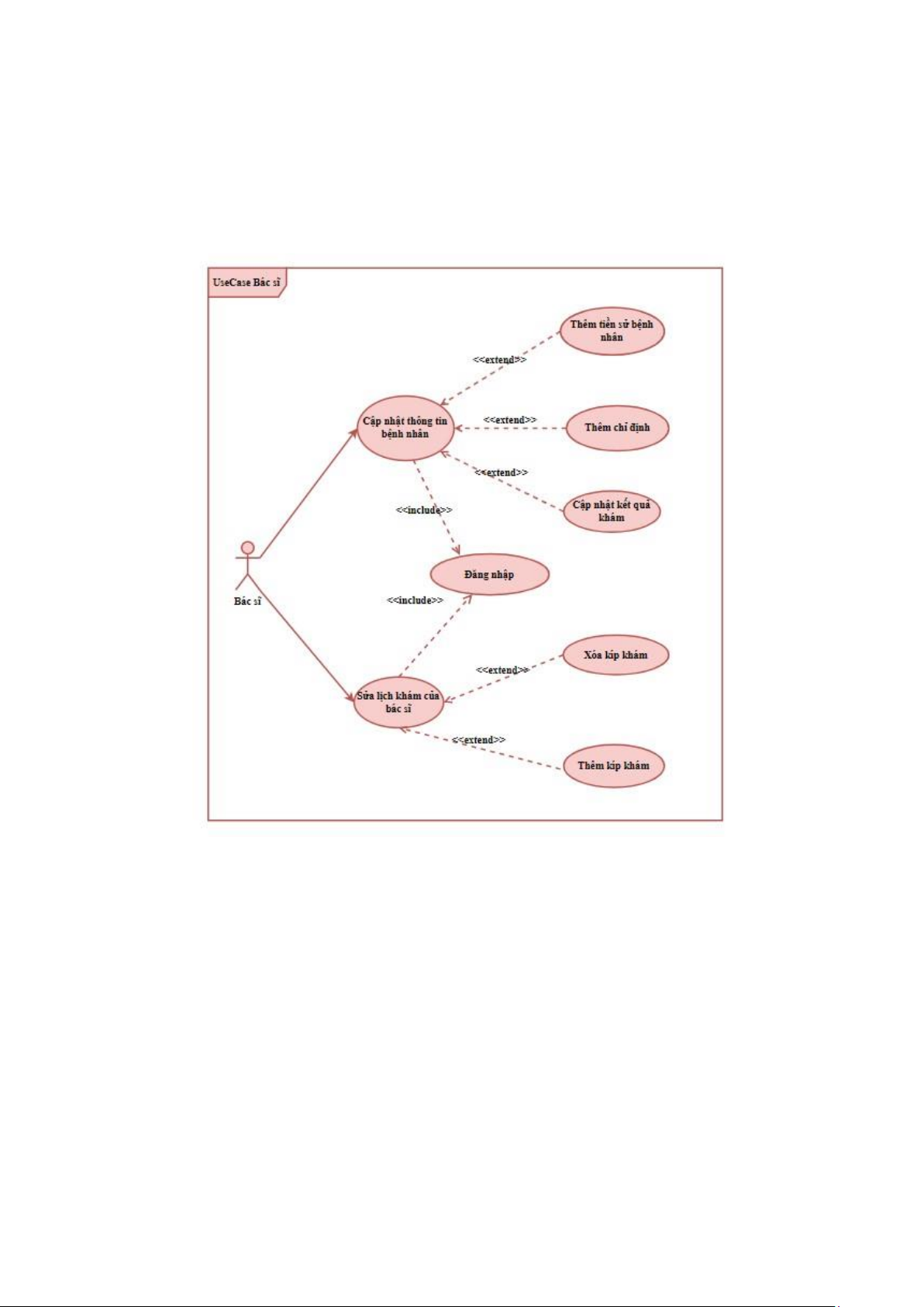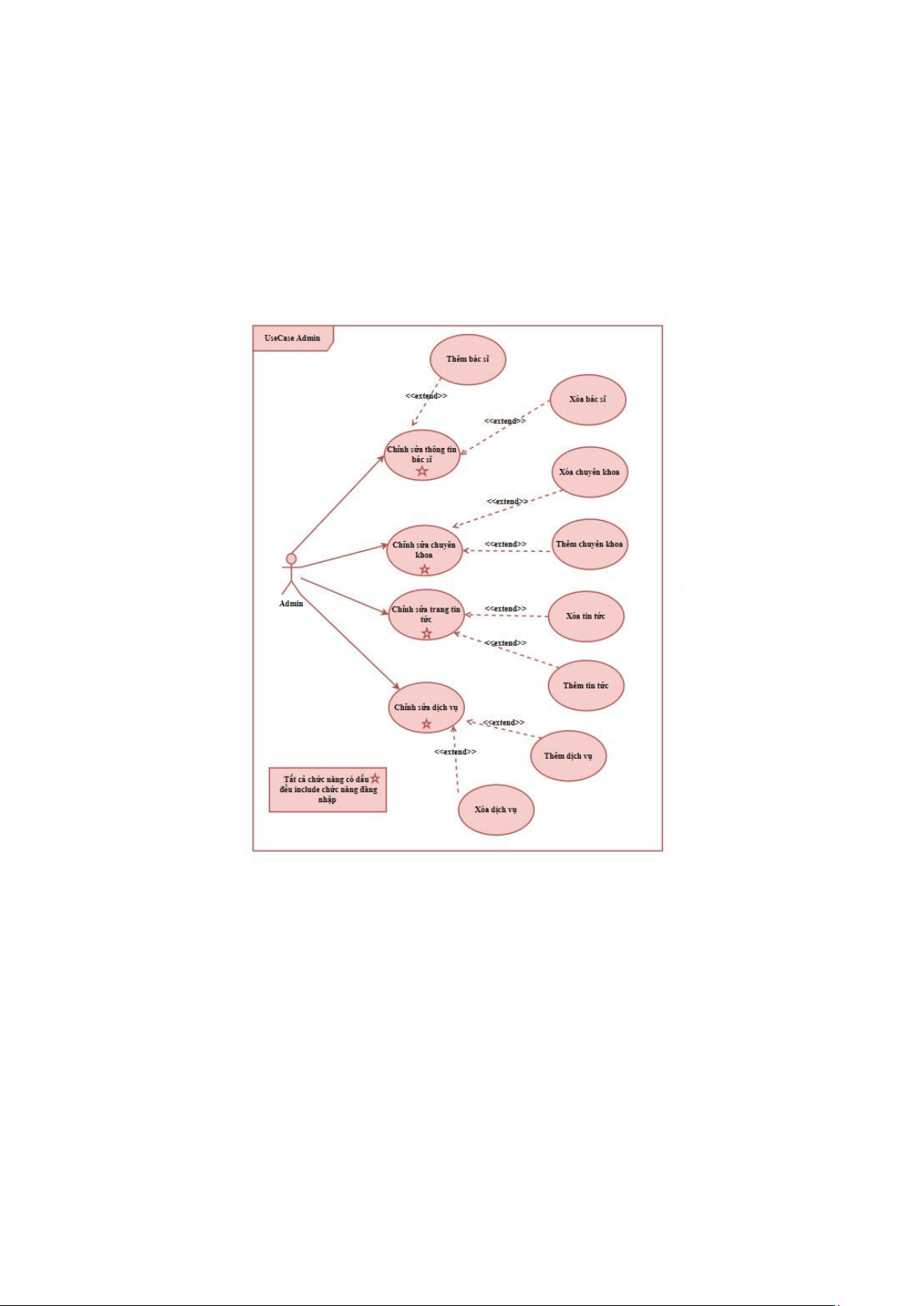 chính phụ sử dụng usecase loại I. Quản trị hệ thống 1 Chỉnh sửa thông Admin Admin chỉnh sửa B Trung tin bác sĩ các thông tin về bình bác sĩ 2 Chỉnh sửa thông Admin Admin chỉnh sửa B Trung tin chuyên khoa các thông tin liên bình quan tới chuyên khoa 3 Chỉnh sửa thông Admin Admin chỉnh sửa B Trung tin dịch vụ thông tin liên quan bình tới thông tin dịch vụ 4 Chỉnh sửa trang Admin Admin chỉnh sửa B Đơn tin tức thông tin trên trang giản tin tức II. Bác sĩ 5 Chỉnh sửa lịch Bác sĩ Bác sĩ chỉnh sửa B Trung khám lịch khám bình
