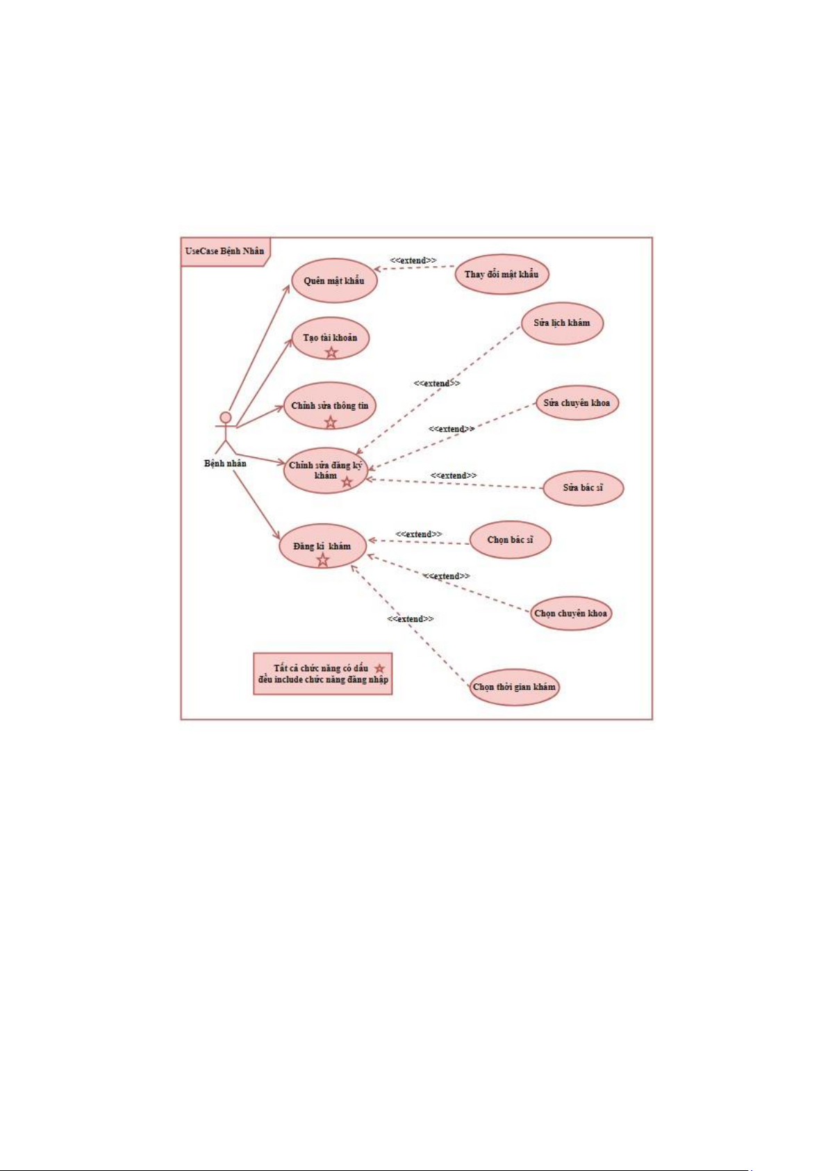III. Bệnh nhân 7 Đăng kí tài Bệnh Đăng kí tài khoản B Đơn khoản nhân với quyền bệnh giản nhân 8 Đăng nhập Bệnh Bệnh nhân đăng B Đơn nhân nhập vào hệ thống giản 9 Đổi mật khẩu Bệnh Bệnh nhân đổi mật B Đơn nhân khẩu giản 10 Đăng xuất Bệnh Kết thúc phiên làm B Đơn nhân việc giản 11 Đăng kí khám Bệnh Bệnh nhân đăng kí B Trung nhân khám: được chọn bình chuyên khoa, chọn lịch khám, chọn bác sĩ