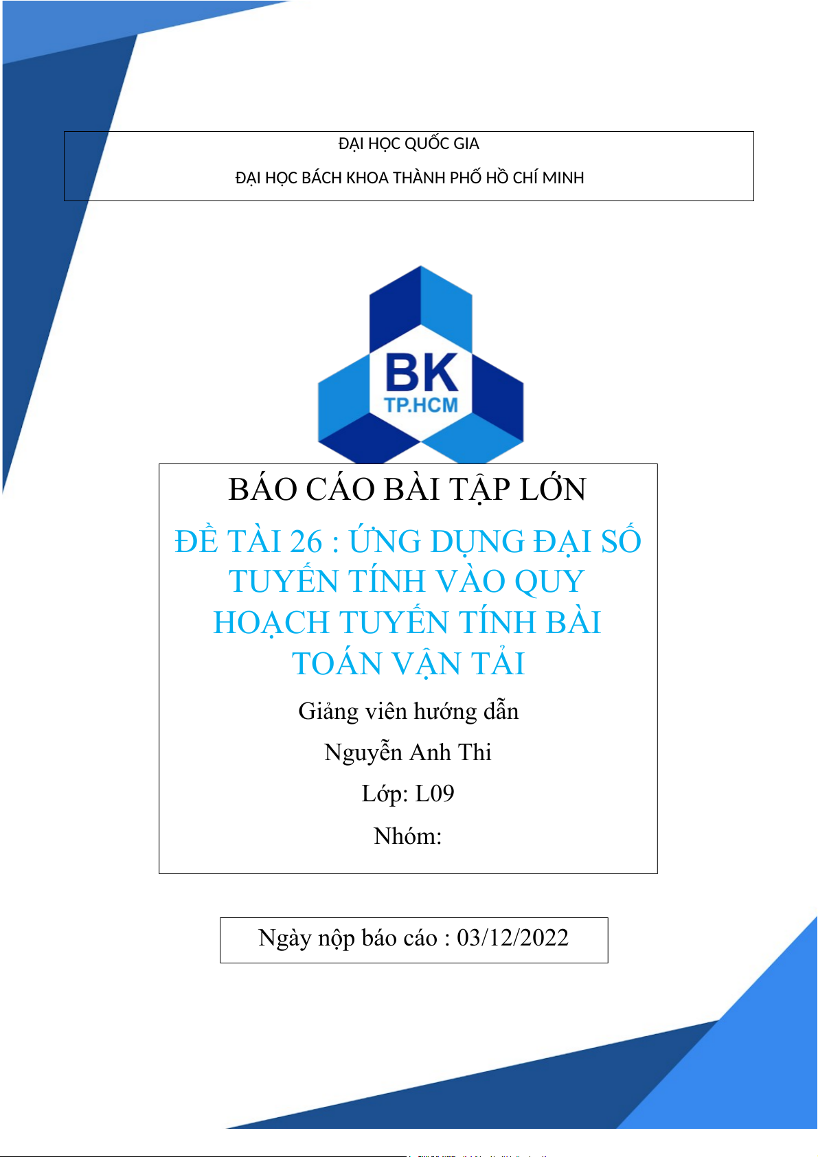 ĐỀ TÀI 26 : ỨNG DỤNG ĐẠI SỐ TUYẾN TÍNH VÀO QUY HOẠCH TUYẾN TÍNH BÀI TOÁN VẬN TẢI Giảng viên hướng dẫn Nguyễn Anh Thi Lớp: L09 Nhóm:
