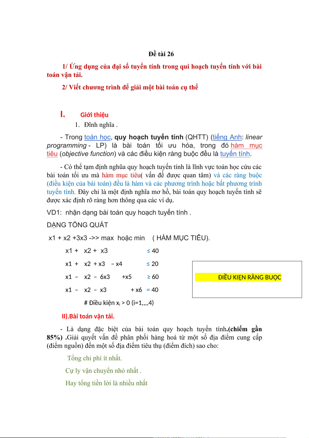 1/ Ứng dụng của đại số tuyến tính trong qui hoạch tuyến tính với bài toán vận tải.