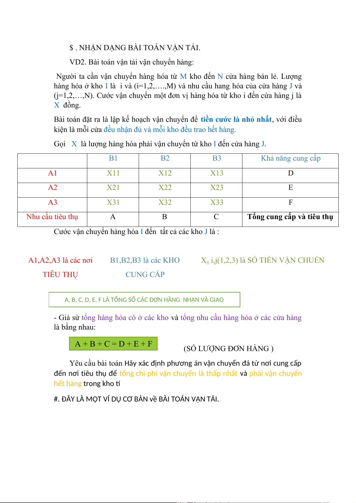 $ . NHẬN DẠNG BÀI TOÁN VẬN TẢI.