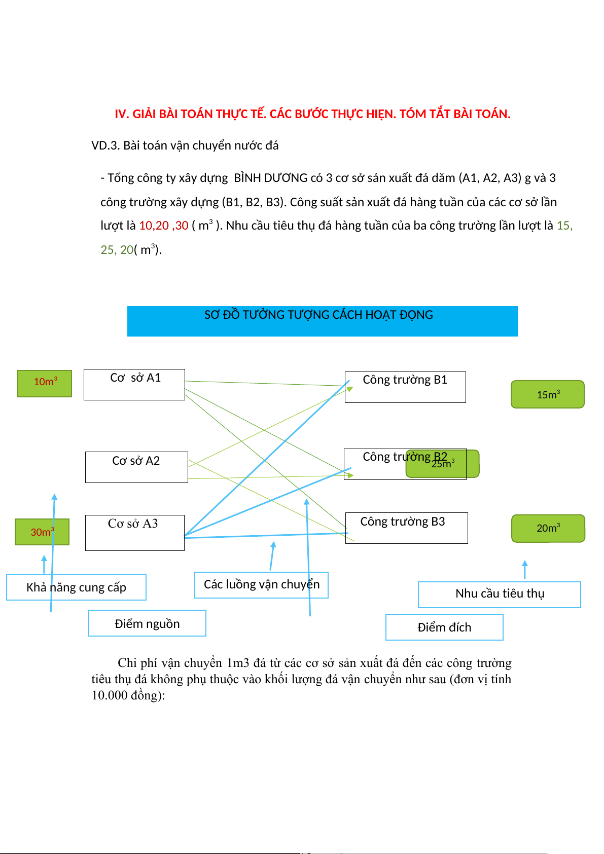 SƠ ĐỒ TƯỞNG TƯỢNG CÁCH HOẠT ĐỘNG Cơ sở A1 10m3 Công trường B1 15m3 Công trường B2 Cơ sở A2 25m3 Cơ sở A3 Công trường B3 30m3 20m3 Các luồng vận chuyển Khả năng cung cấp Nhu cầu tiêu thụ Điểm nguồn Điểm đích