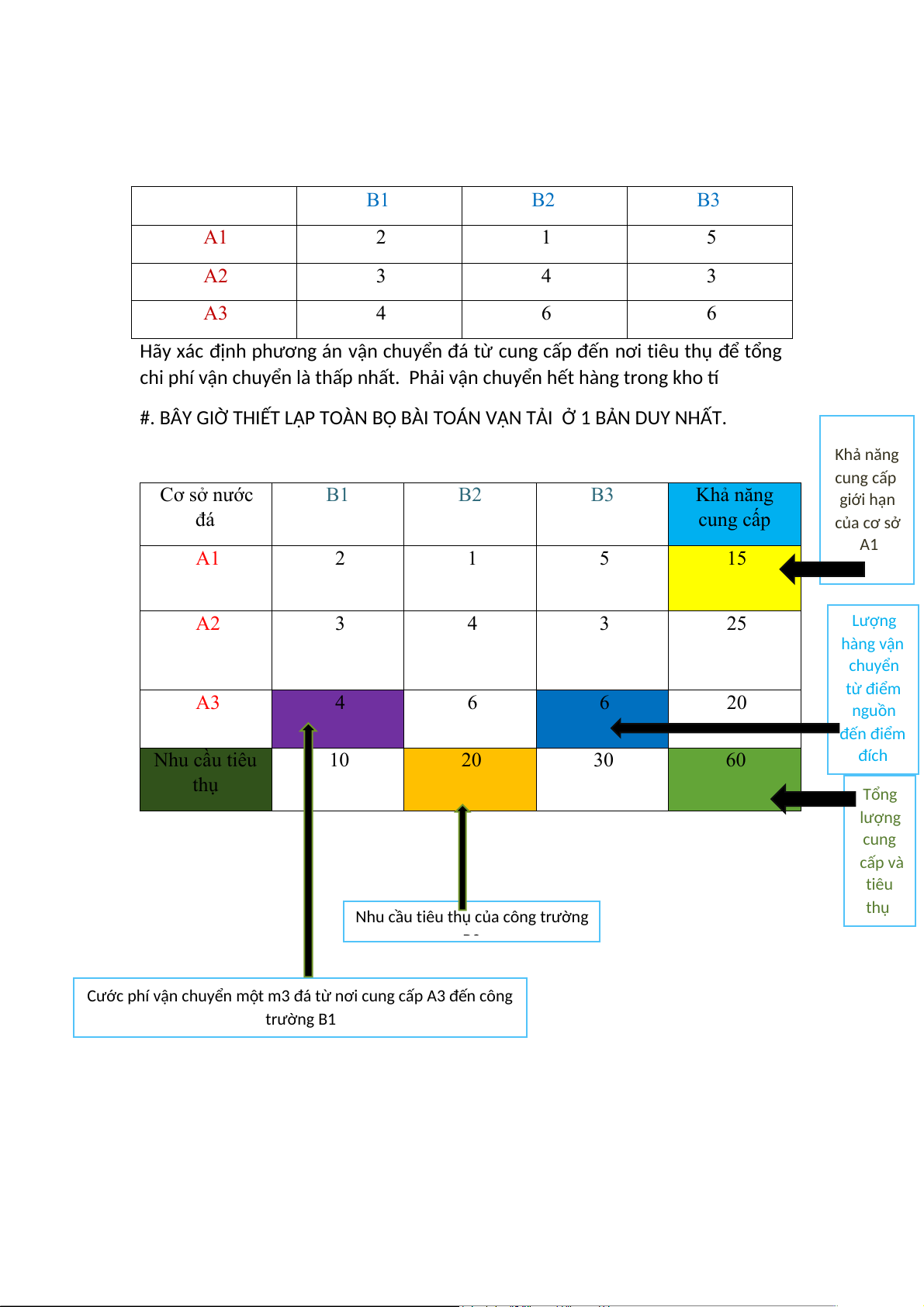 #. BÂY GIỜ THIẾT LẬP TOÀN BỘ BÀI TOÁN VẬN TẢI Ở 1 BẢN DUY NHẤT. Khả năng cung cấp Cơ sở nước B1 B2 B3 Khả năng giới hạn đá cung cấp của cơ sở A1 A1 2 1 5 15 A2 3 4 3 25 Lượng hàng vận chuyển từ điểm A3 4 6 6 20 nguồn đến điểm Nhu cầu tiêu 10 20 30 60 đích thụ Tổng lượng cung cấp và tiêu