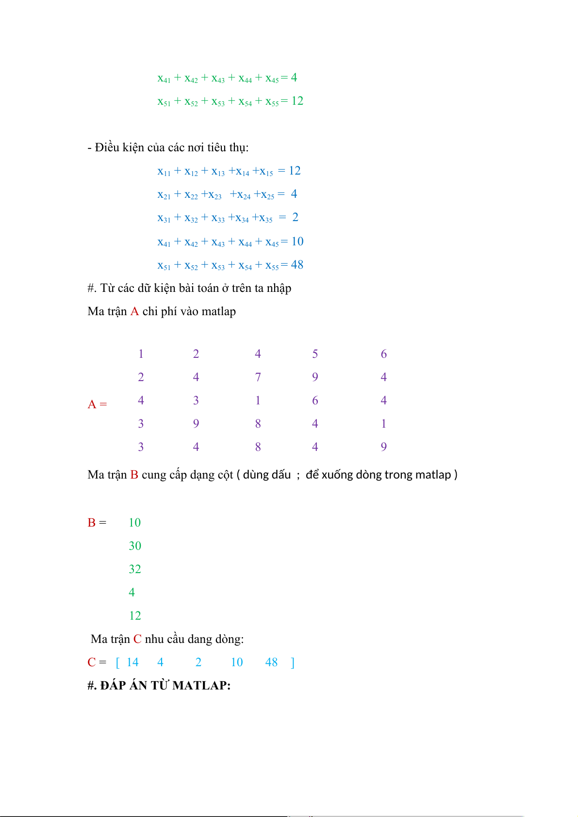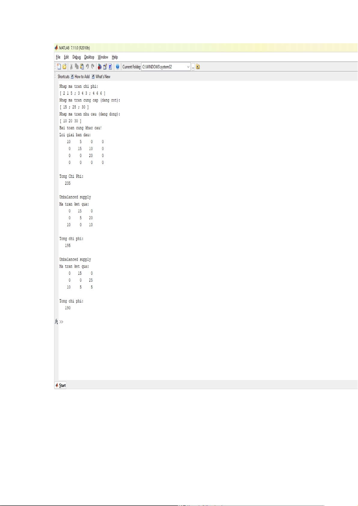 ĐÂY LÀ KẾT QUẢ TỐI ƯU NHẤT TỪ MATLAP Ma tran ket qua: 0 15 0 0 0 25 10 5 5 Tong chi phi toi uu nhat: