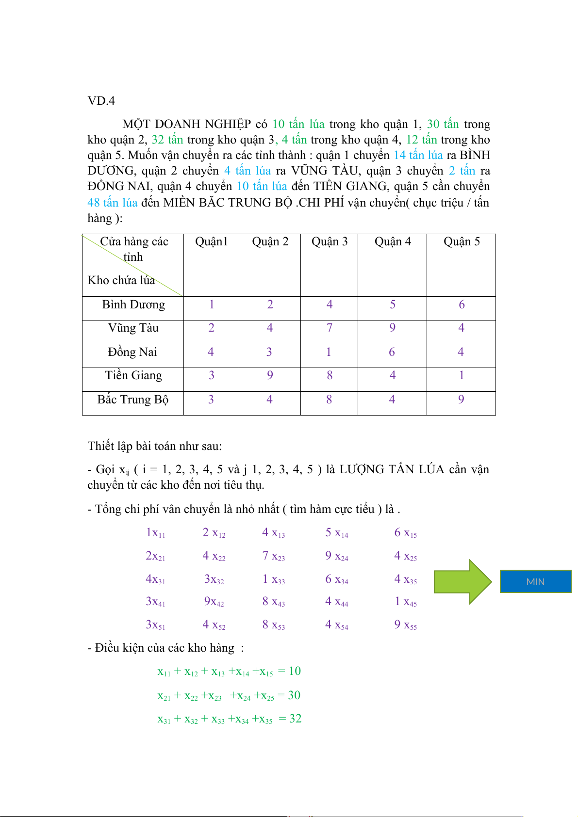 48 tấn lúa đến MIỀN BĂC TRUNG BỘ .CHI PHÍ vận chuyển( chục triệu / tấn hàng ): Cửa hàng các Quận1 Quận 2 Quận 3 Quận 4 Quận 5 tỉnh Kho chứa lúa Bình Dương 1 2 4 5 6 Vũng Tàu 2 4 7 9 4 Đồng Nai 4 3 1 6 4 Tiền Giang 3 9 8 4 1 Bắc Trung Bộ 3 4 8 4 9