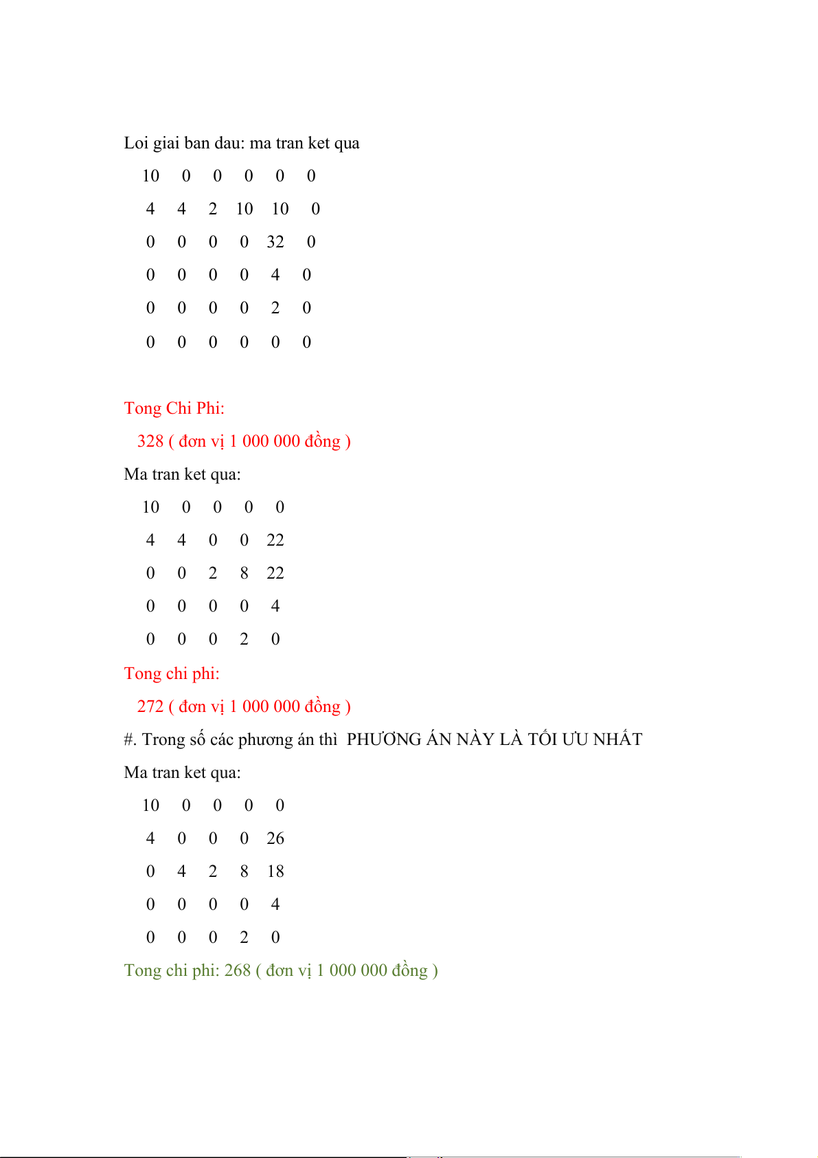 328 ( đơn vị 1 000 000 đồng ) Ma tran ket qua: 10 0 0 0 0 4 4 0 0 22 0 0 2 8 22 0 0 0 0 4 0 0 0 2 0 Tong chi phi: