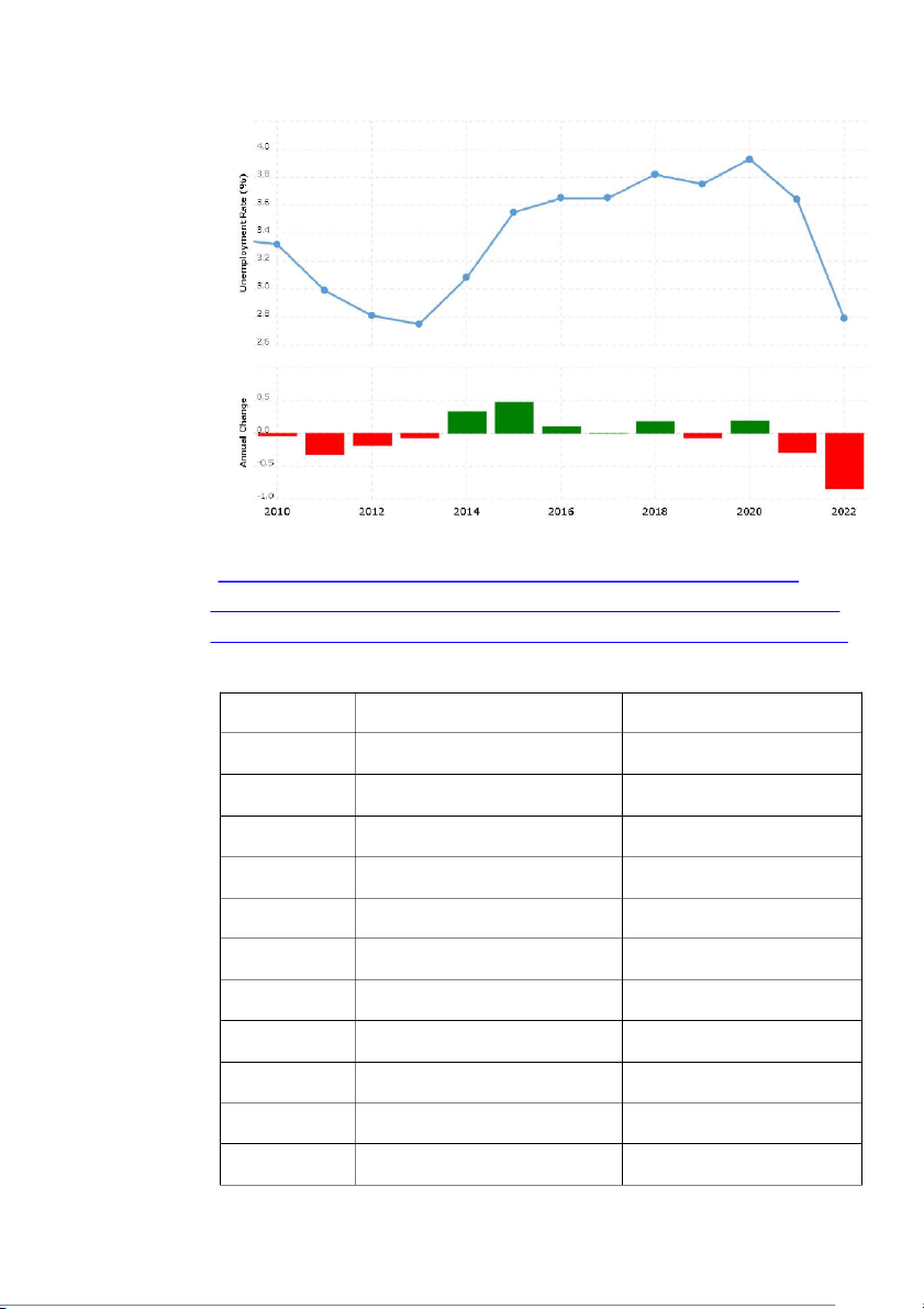 %20the%20share,a%200.29%25%20decline%20from%202020 ) Năm Tỷ lệ thất nghiệp So với năm trước 2012 2,81% 0,18% 2013 2,75% 0,06% 2014 3,08% 0,33% 2015 3,55% 0,47% 2016 3,65% 0,1% 2017 3,65% Không đổi 2018 3,82% 0,17% 2019 3,75% -0,07% 2020 3,93% 0,18% 2021 3,64% -0,29% 2022 2,79% -0,85% 6