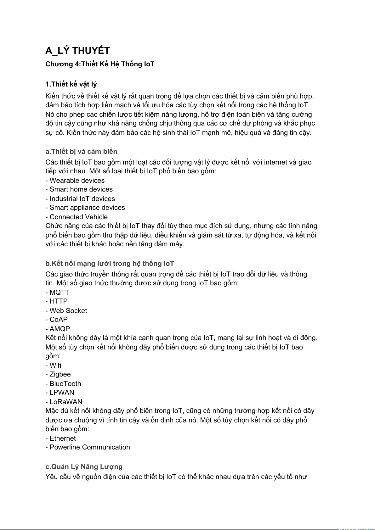 được ưa chuộng vì tính tin cậy và ổn định của nó. Một số tùy chọn kết nối có dây phổ biến bao gồm: - Ethernet - Powerline Communication c.Quản Lý Năng Lượng