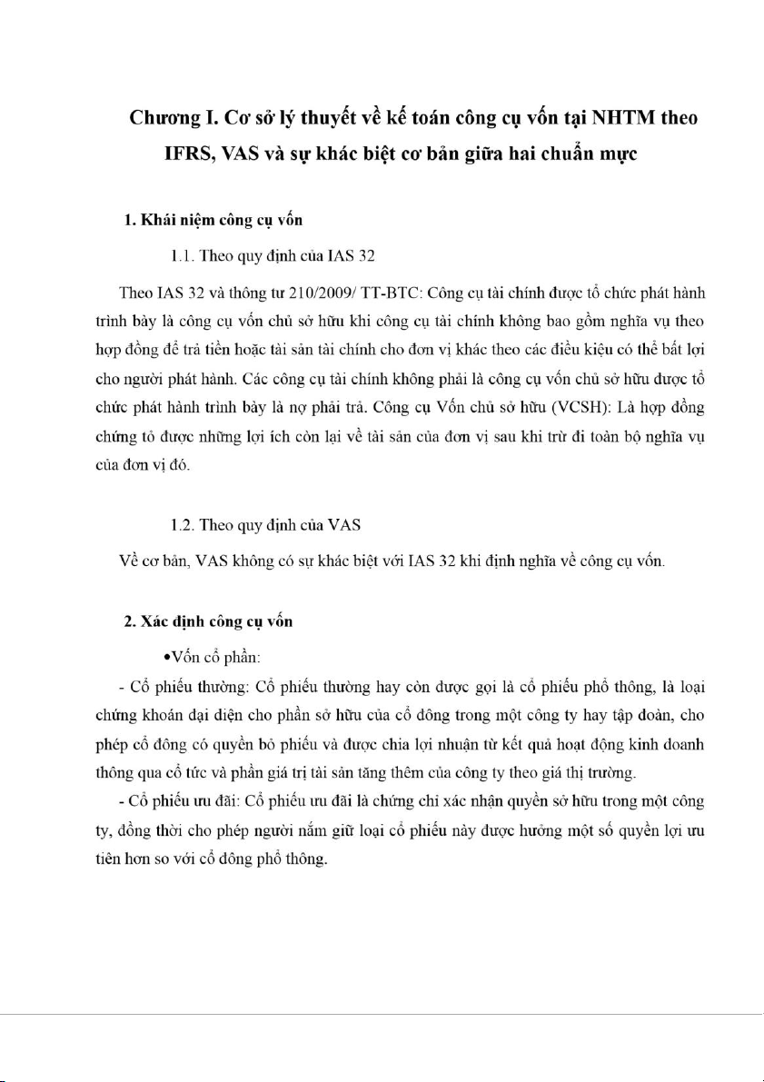 Chương I. Cơ sở lý thuyết về kế toán công cụ vốn tại NHTM theo IFRS, VAS và sự