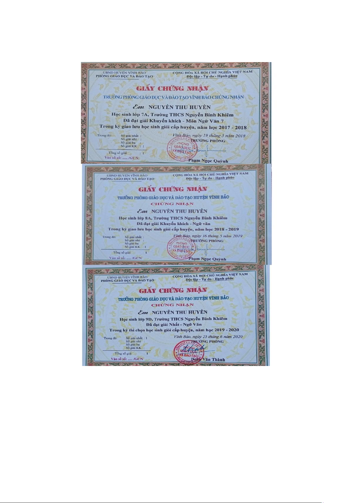( Hình ảnh giấy chứng nhận đạt giải môn Ngữ Văn qua các năm học 2017-2020)