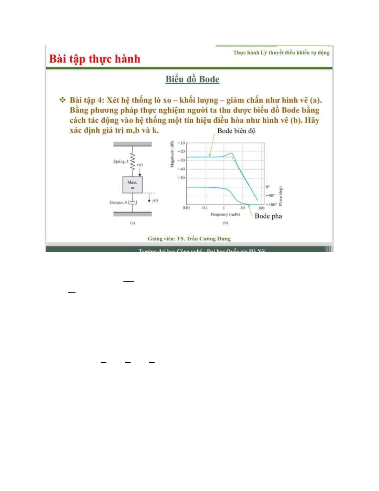 x0 = log[l + a(s)] = -25 (s 0) l + G(s) = 10 (s 0) 1 = 0.056 => k = 17.786 k √ k 0 f = m 2π √ k = ω = 3 rad/s m k m = = 2.9758 kg g lOMoAR cPSD| 58833082 1 θ = √ mk = 5 dB b • 20log(θ) = 5 dB • θ = 10 • mk = 1.7782 => b = 3.33 b Họ và tên: