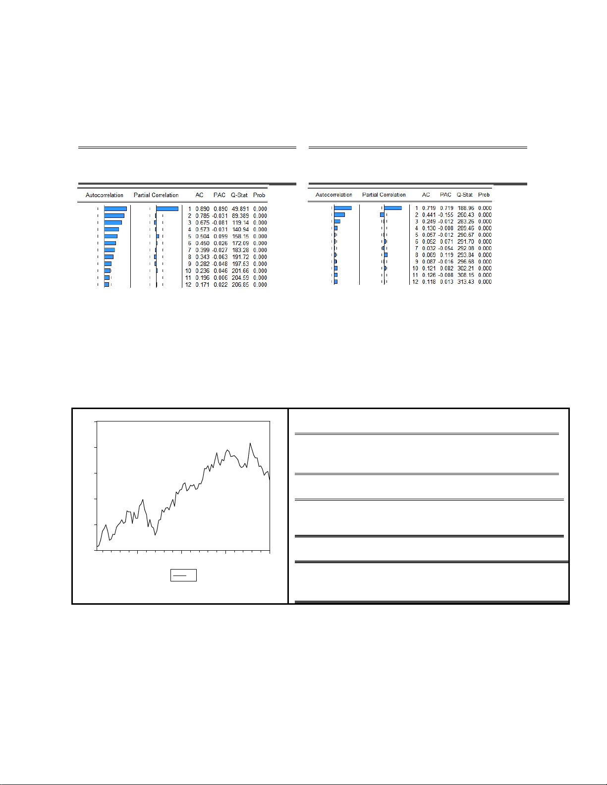 Kiểm định có hệ số chặn, không có xu thế 8 Test Statistic -3.961119 1% Critical Value* -3.5457 5% Critical Value -2.9118 4 10% Critical Value -2.5932 Kiểm định có xu thế 0 25 50 75 100 Test Statistic -3.901491 1% Critical Value* -4.1219 X 5% Critical Value -3.4875 10% Critical Value -3.1718
