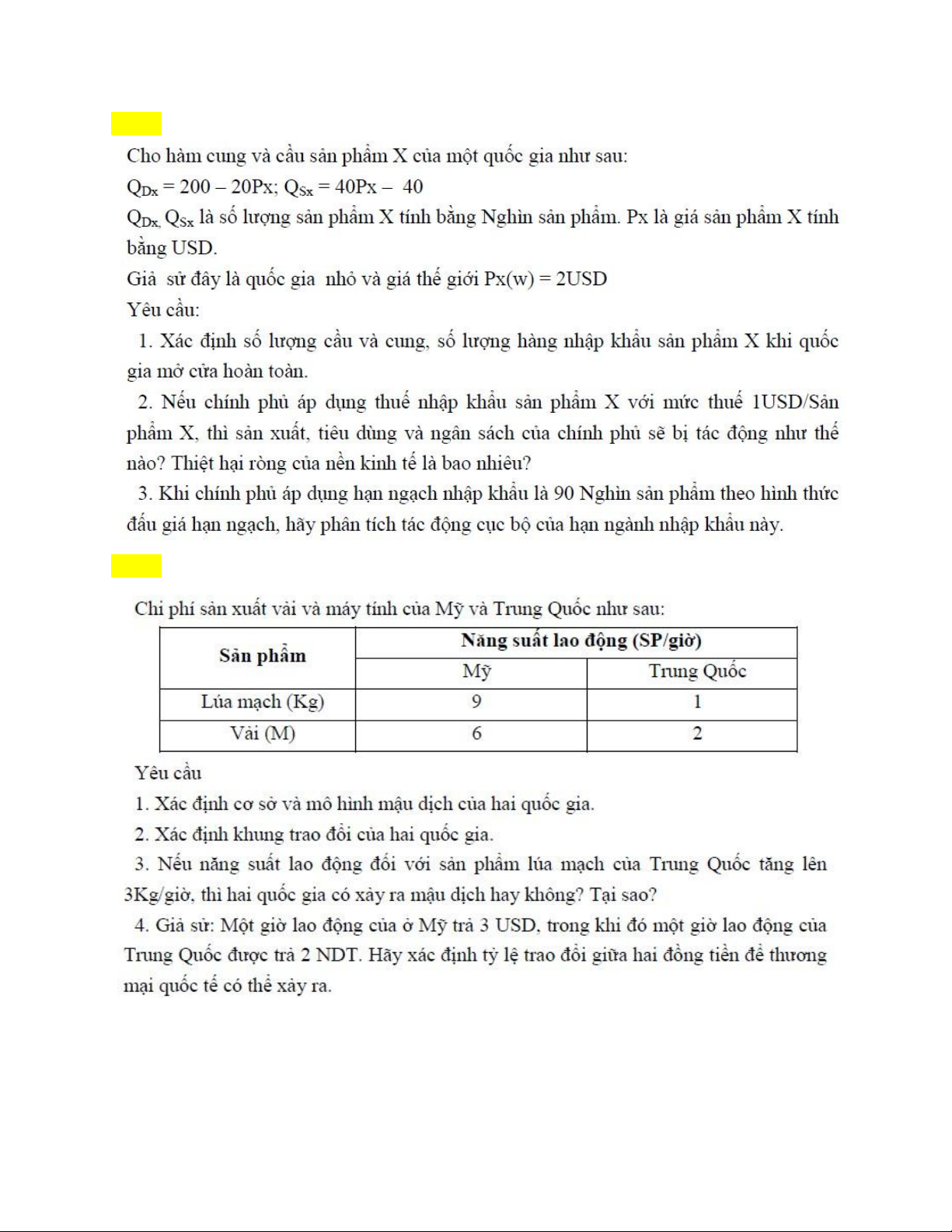 Giá mặt hàng X trên thị trường thế giới tự do là 20$ Yêu cầu: