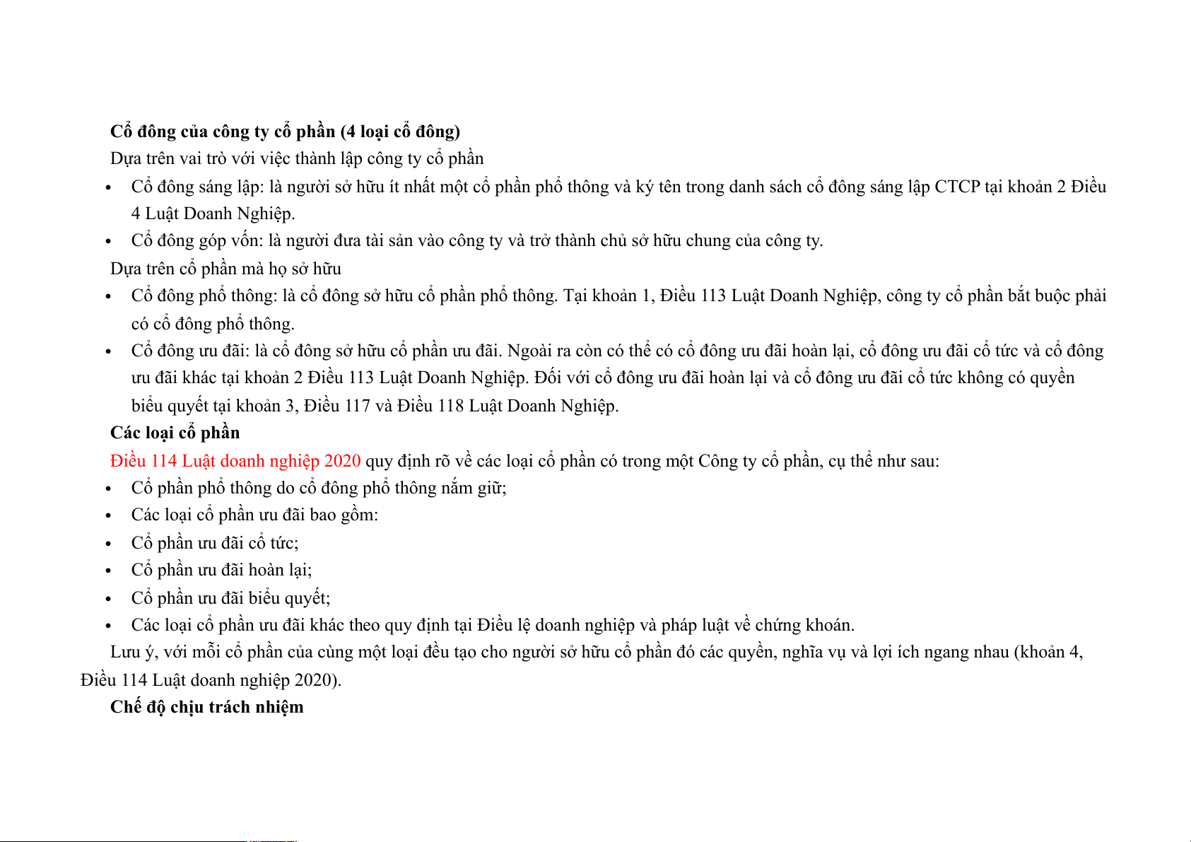 Điều 114 Luật doanh nghiệp 2020 quy định rõ về các loại cổ phần có trong một Công ty cổ phần, cụ thể như sau: