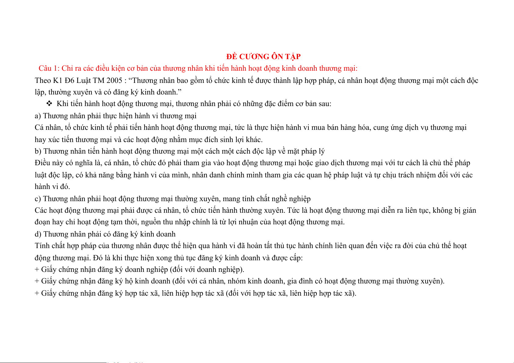 Câu 1: Chỉ ra các điều kiện cơ bản của thương nhân khi tiến hành hoạt động kinh doanh thương mại: