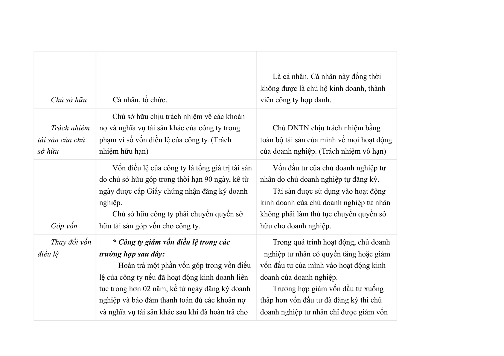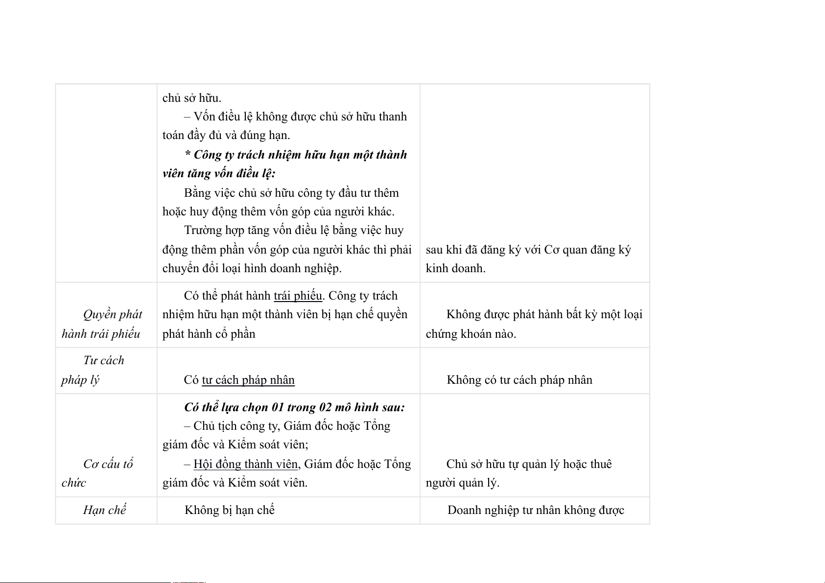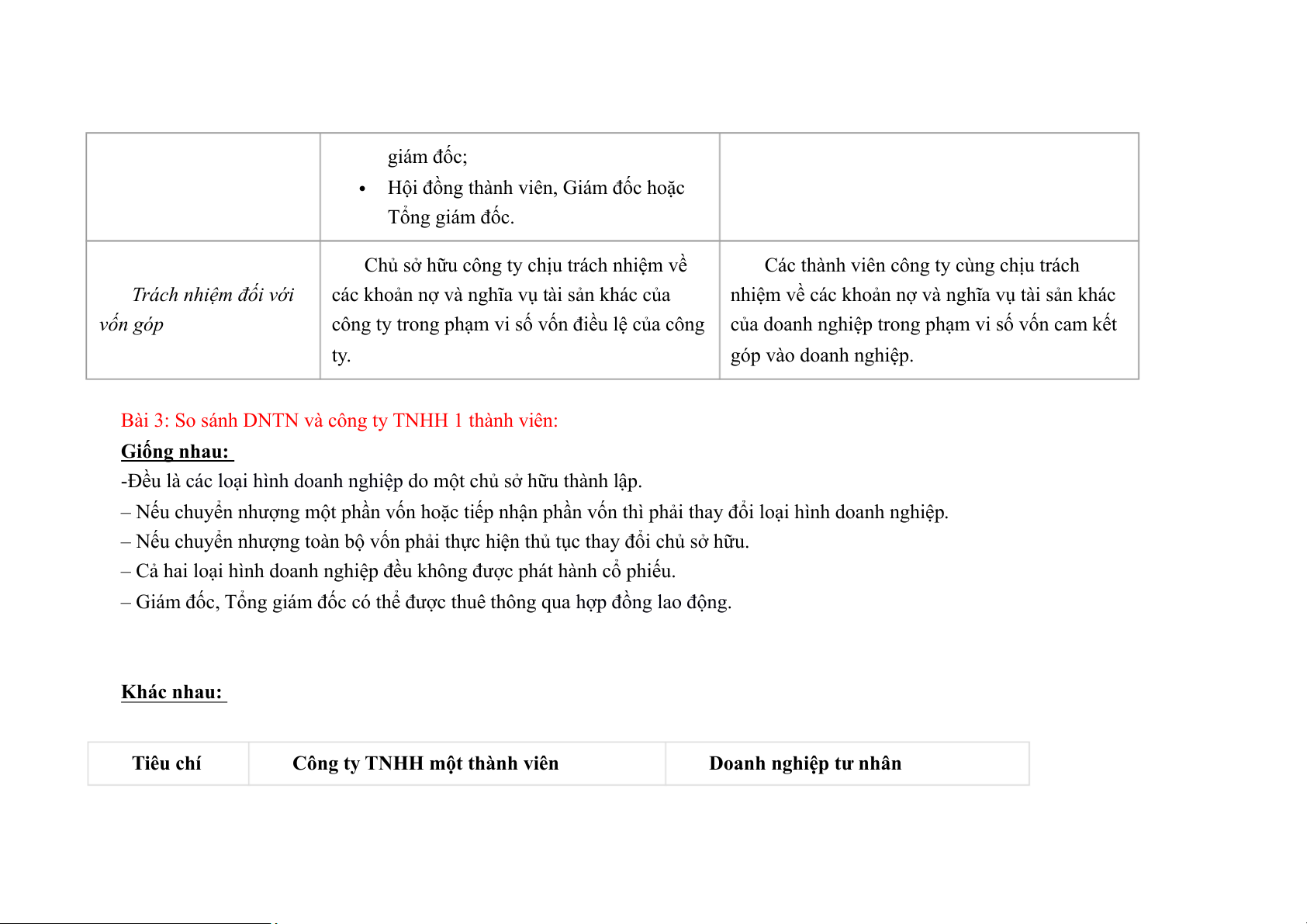- Vốn và chế độ tài chính :Thủ tục thành lập, giải thể và phá sản như nhau Khác nhau: Tiêu chí Công ty TNHH 1 thành viên