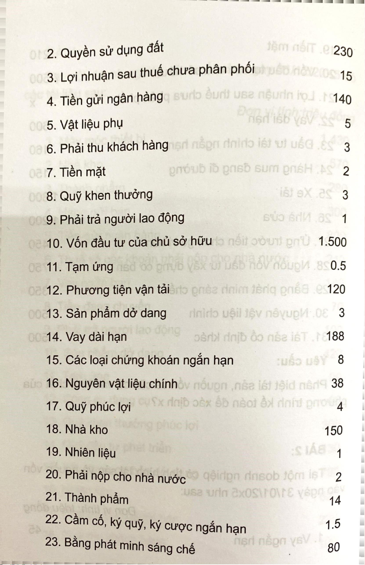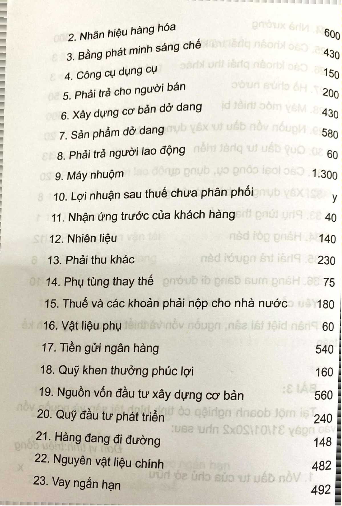 18 . Quy khen thu&ng phüc Iqi 160 . 19 Nguòn v6n dàu tu' xây 560 dyng cc bàn 20. Quy dàu tu' phét trién 240 21 . Hàng dang di du'òng 148 . 22 Nguyên vêt liëu chinh 482 . 23 Vay n gén ha n 492 lOMoAR cPSD| 61552889 . 24 700 TiÔn măt 25 79 . Tąm ó'ng 26 2.500 . Tăi sân cÓ dinh khóc 27 890 . Móy dôt 28 86 . Thânh phâm 29 120 . Phâi thu coa khâch hâng 30 200 . Xe du lich Yôu câu: