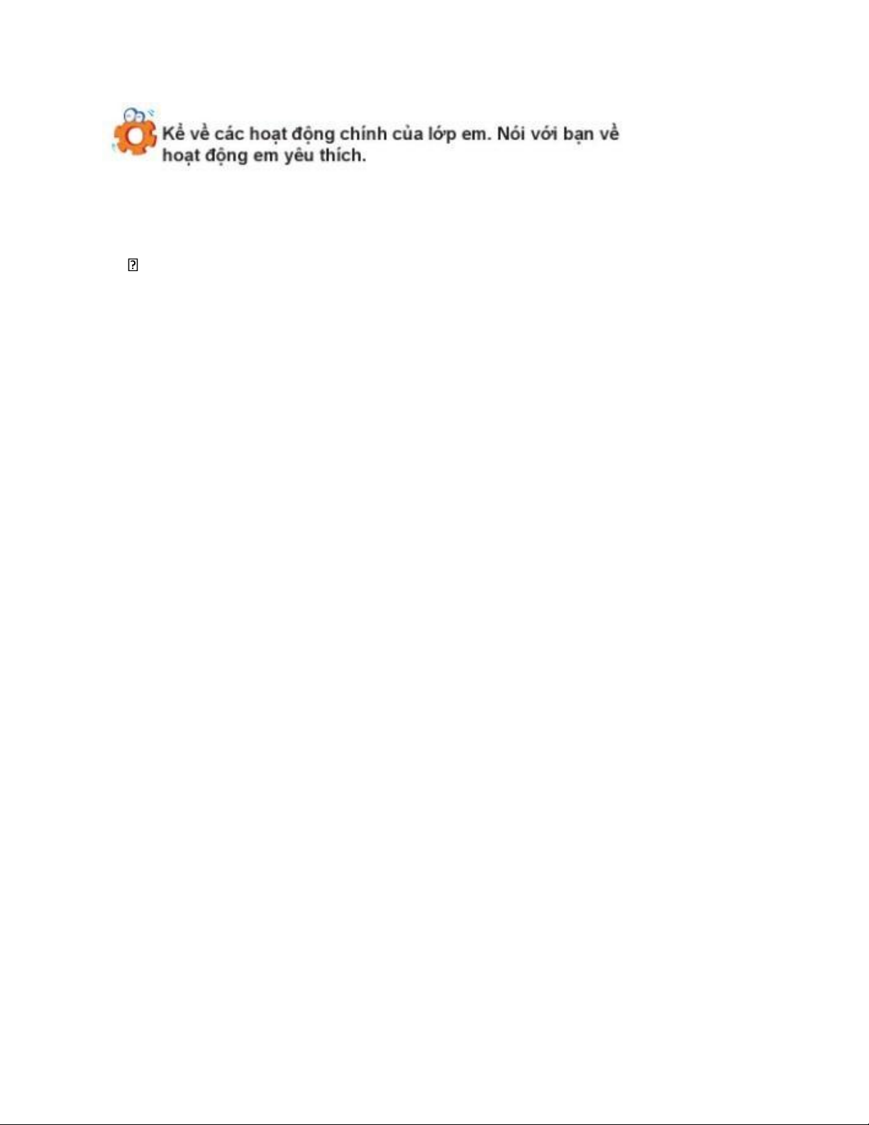 - Mục tiêu: Kể về các hoạt động chính của lớp em, hoạt động em yêu thích