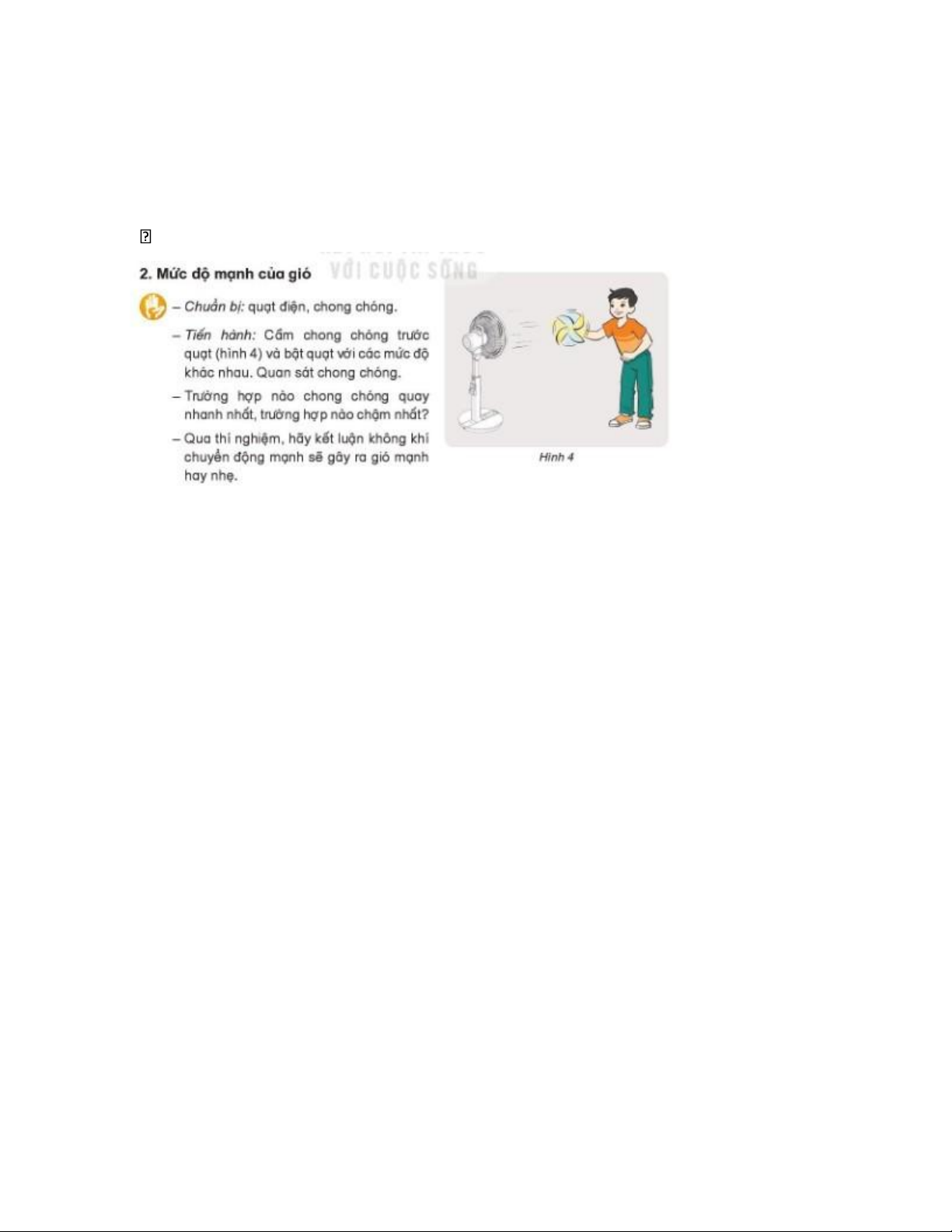 + Tiến hành: Cấm chong chóng trước quạt (hình 4) và bật quạt với các mức độ