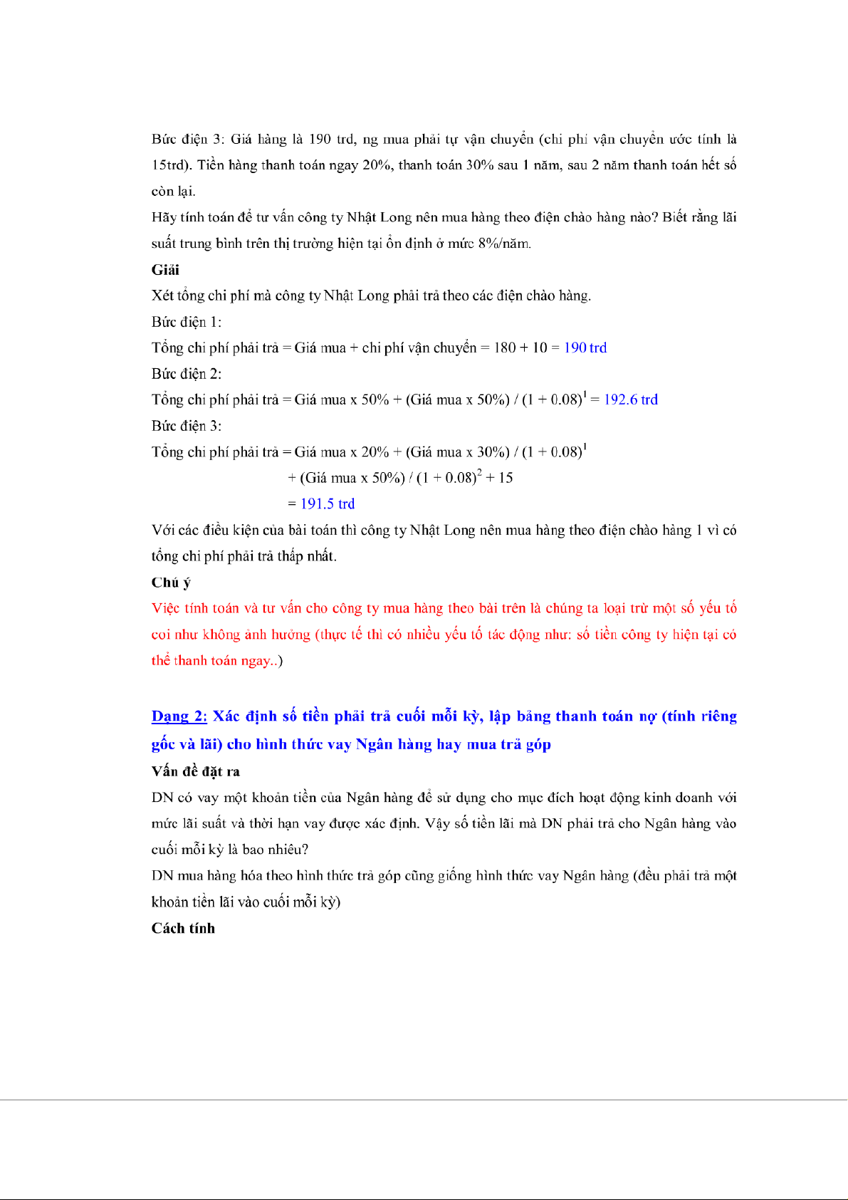 Doanh nghiệp mua một hàng hóa và có các cách thức chi trả số tiền thanh toán này khác nhau: thanh toán ngay; thanh toán 1 nửa còn lại trả sau 1 năm; thanh toán ngay 20%, sau 2 năm thanh toán 30%, sau 2 năm thanh toán hết. Vậy DN nên mua hàng theo cách thanh toán nào là tốt nhất? Ở đây, cách tốt nhất được hiểu là có tổng chi phí (số tiền thanh toán) thấp nhất. Tài liệu giúp bạn tham khảo, ôn tập và đạt kết quả cao. Mời đọc đón xem!