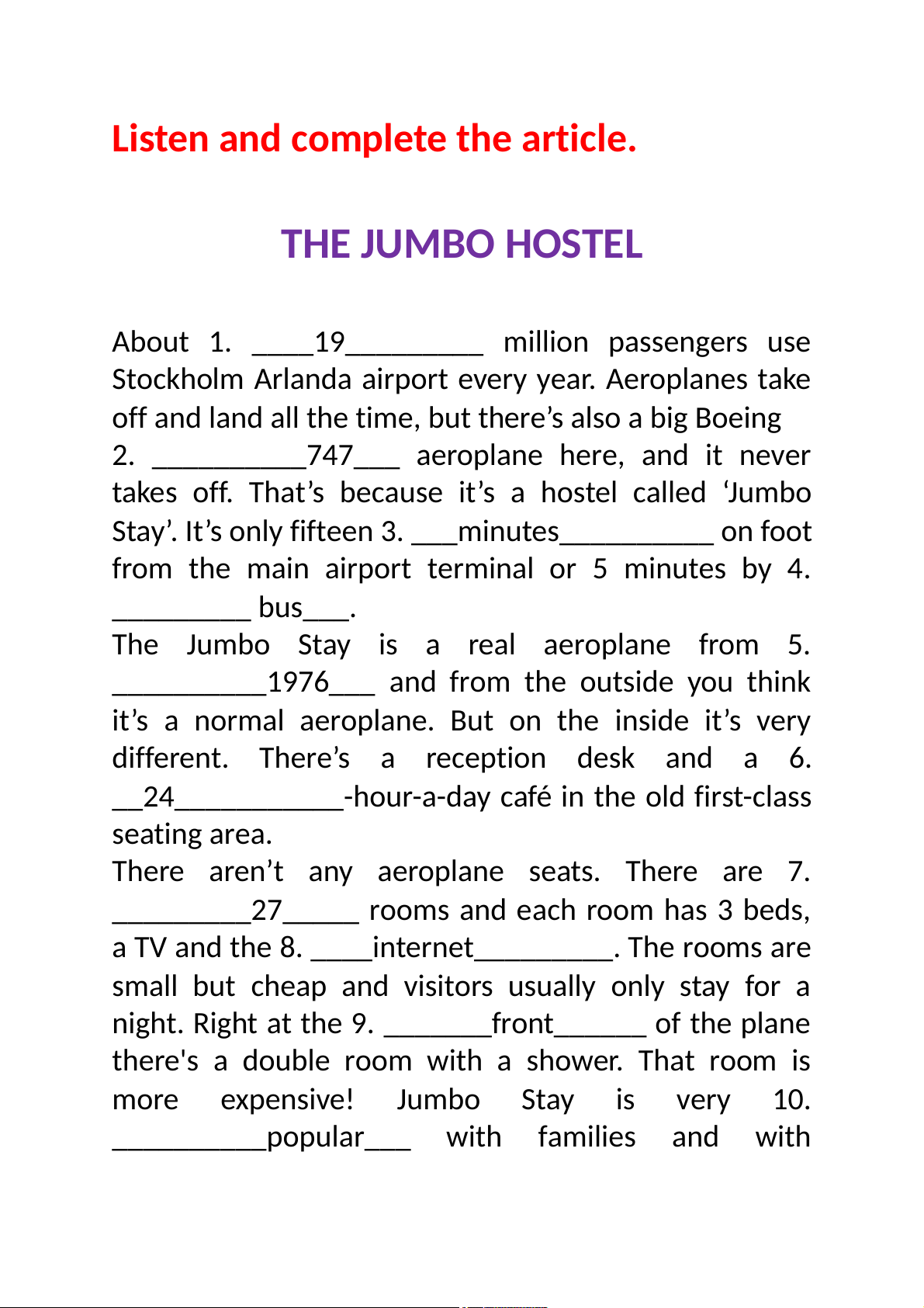 Listen and complete the article. THE JUMBO HOSTEL