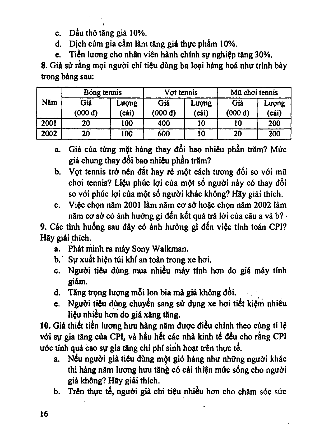 8. Giả sử rằng mọi người chỉ tiêu dùng ba loại hàng hoá như trình bày ừong bảng sau: Bóng tennis Vợt tennis Mũ chơi tennis Năm Giá Lượng Giá Lượng Giá Lượng (000 đ) (cái) (000 đ) (cái) (000 đ) (cái) 2001 20 100 400 10 10 200 2002 20 100 600 10 20 200