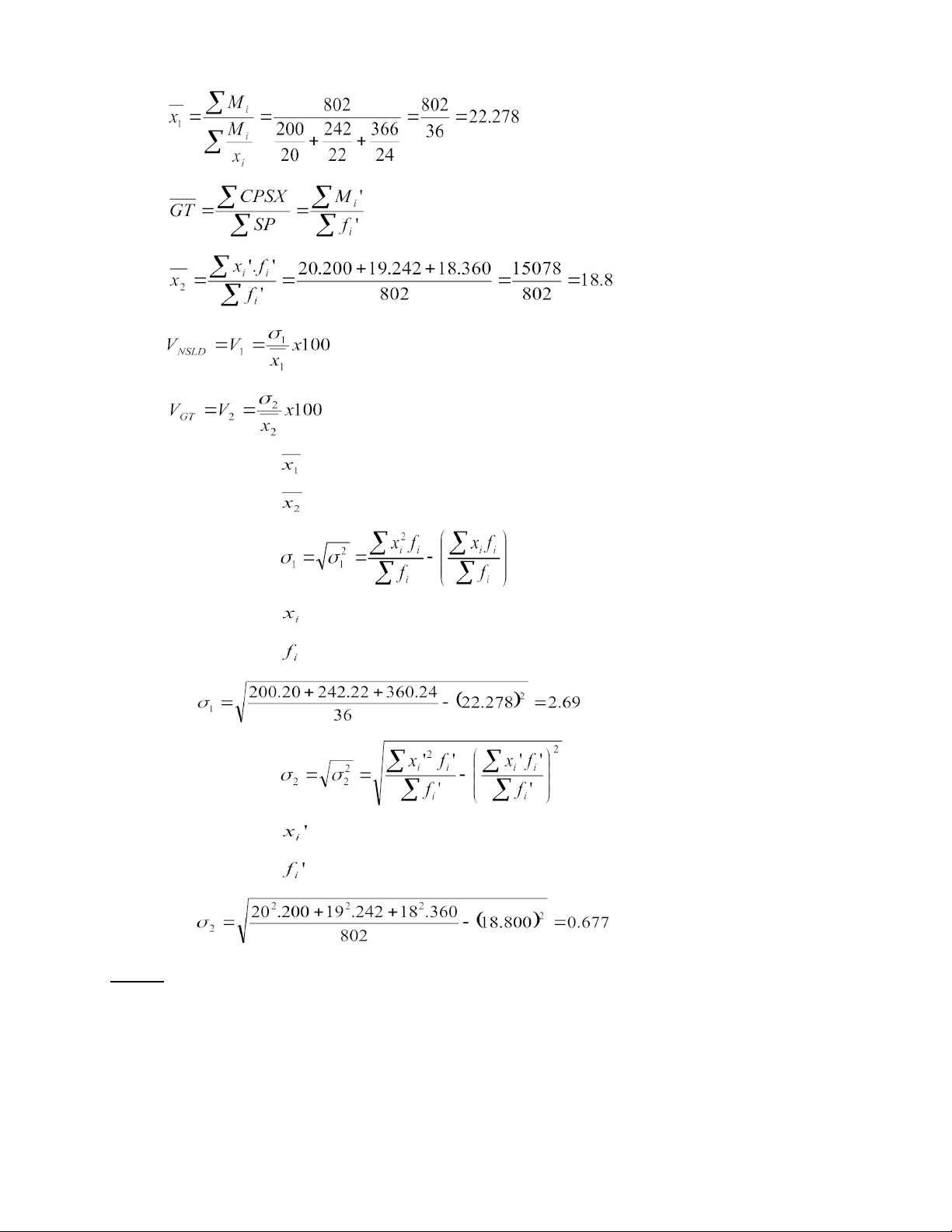 3. So sánh độ phân tán giữa năng suất lao động và giá thành đơn vị sản phẩm. Giải: 1. Trang 4 (sp/cn) 2. (triệu đồng/sp) 3. Trong đó: = 22.278 (sp/cn) = 18.800 (triệu đồng/sp)