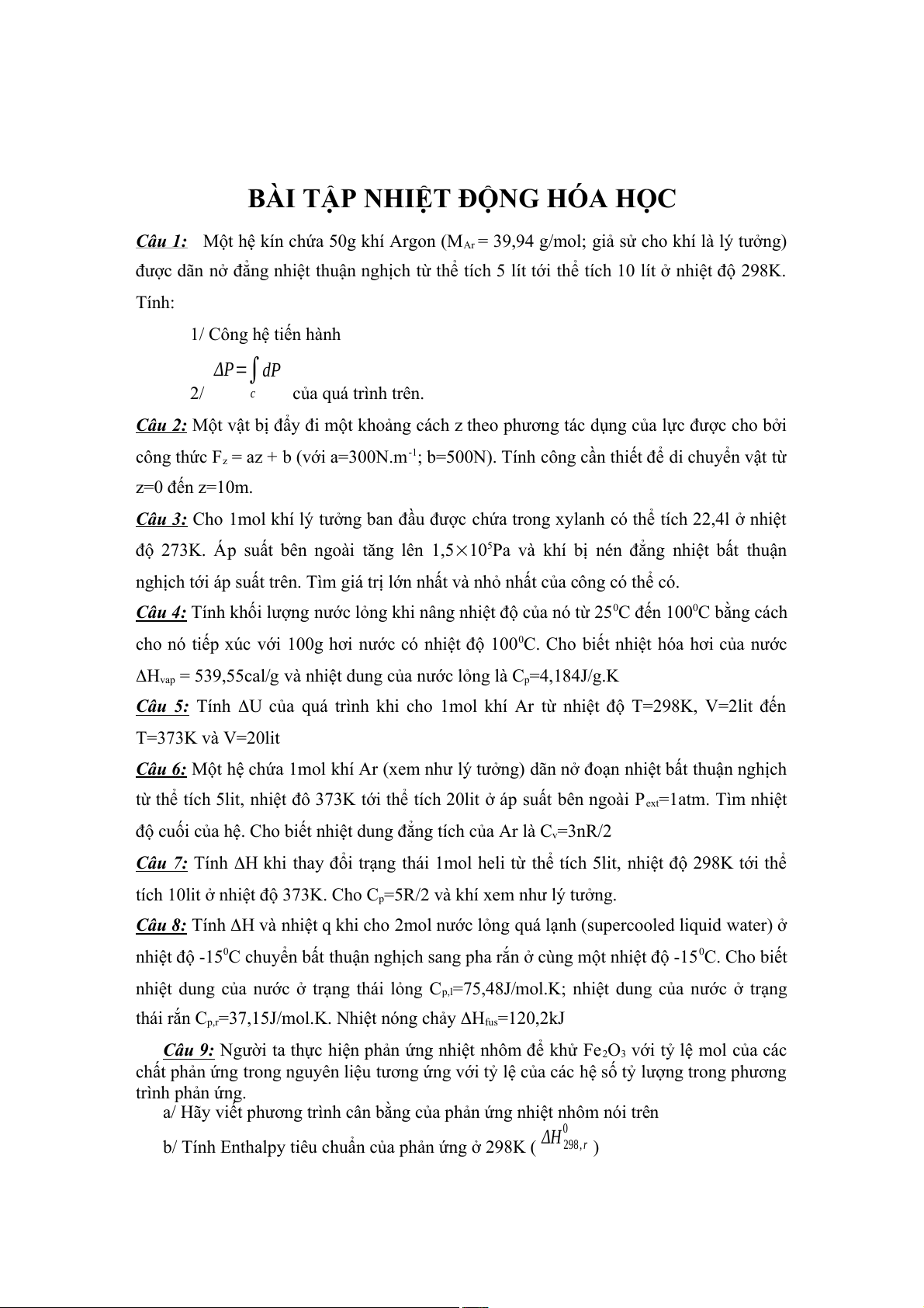 Câu 1: Một hệ kín chứa 50g khí Argon (MAr = 39,94 g/mol; giả sử cho khí là lý tưởng)