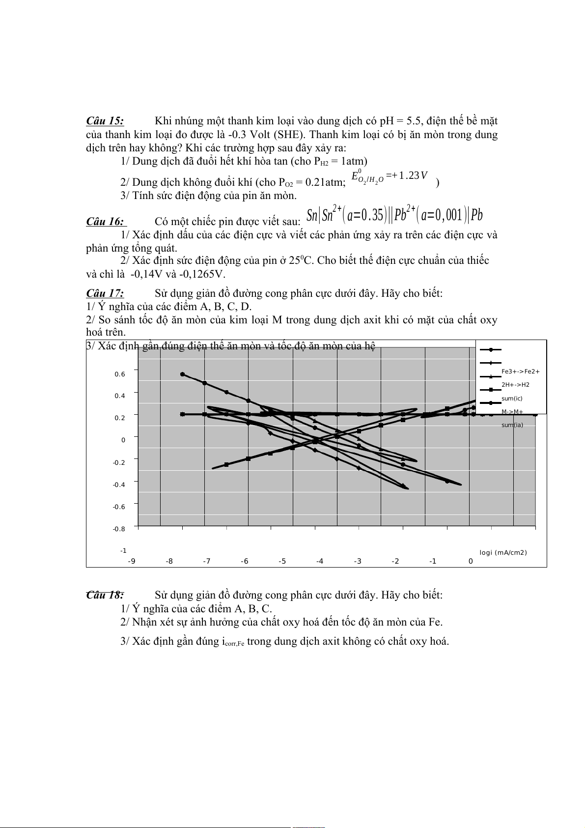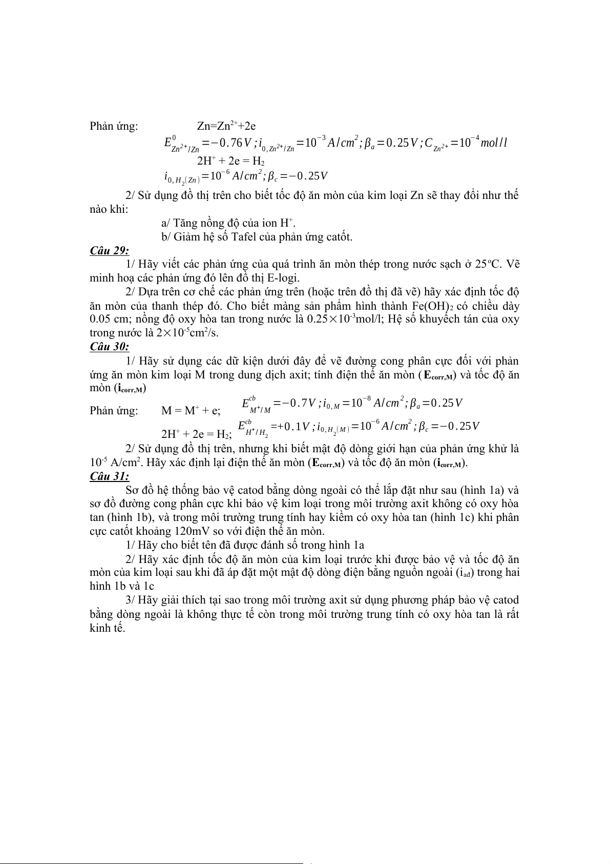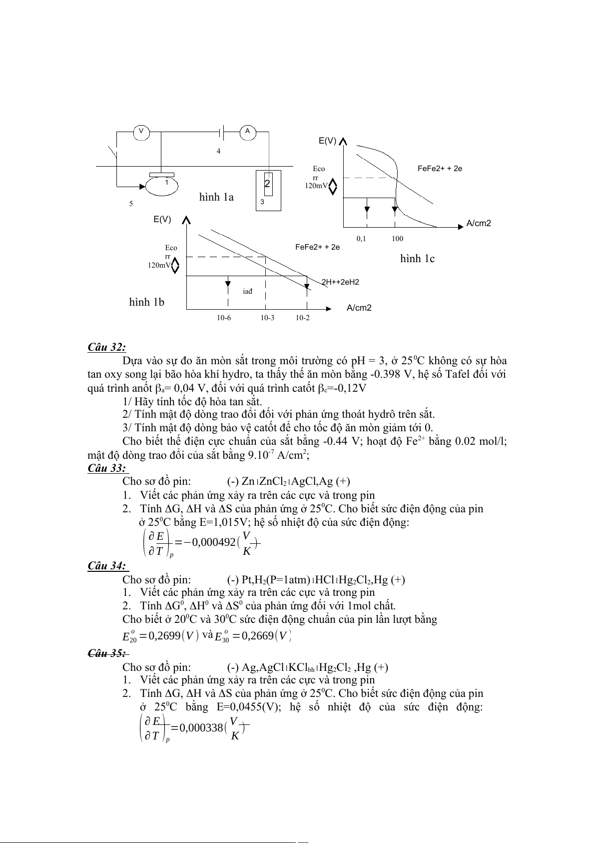 bằng dòng ngoài là không thực tế còn trong môi trường trung tính có oxy hòa tan là rất kinh tế. V A E(V) 4 Eco FeFe2+ + 2e rr 1 2 120mV hình 1a 3 5 E(V) A/cm2 0,1 100 Eco FeFe2+ + 2e rr hình 1c 120mV 2H++2eH2 iađ hình 1b A/cm2 10-6 10-3 10-2 Câu 32: