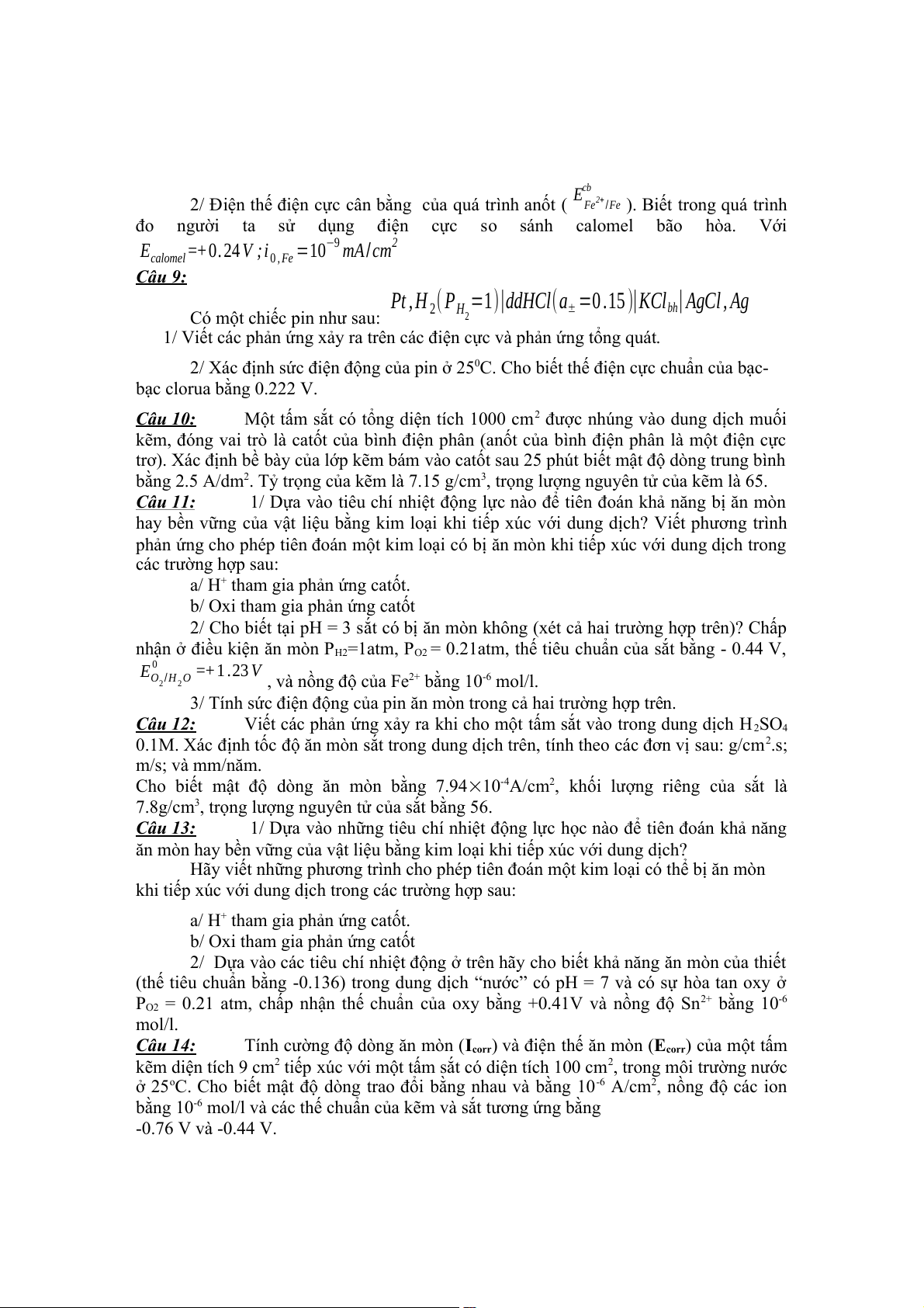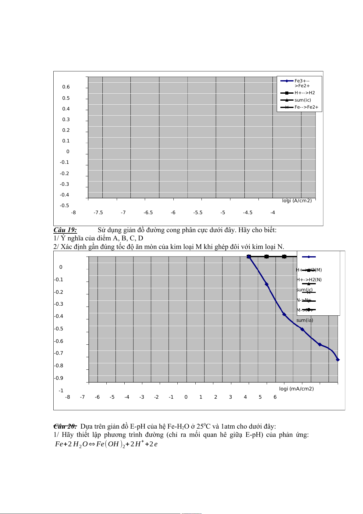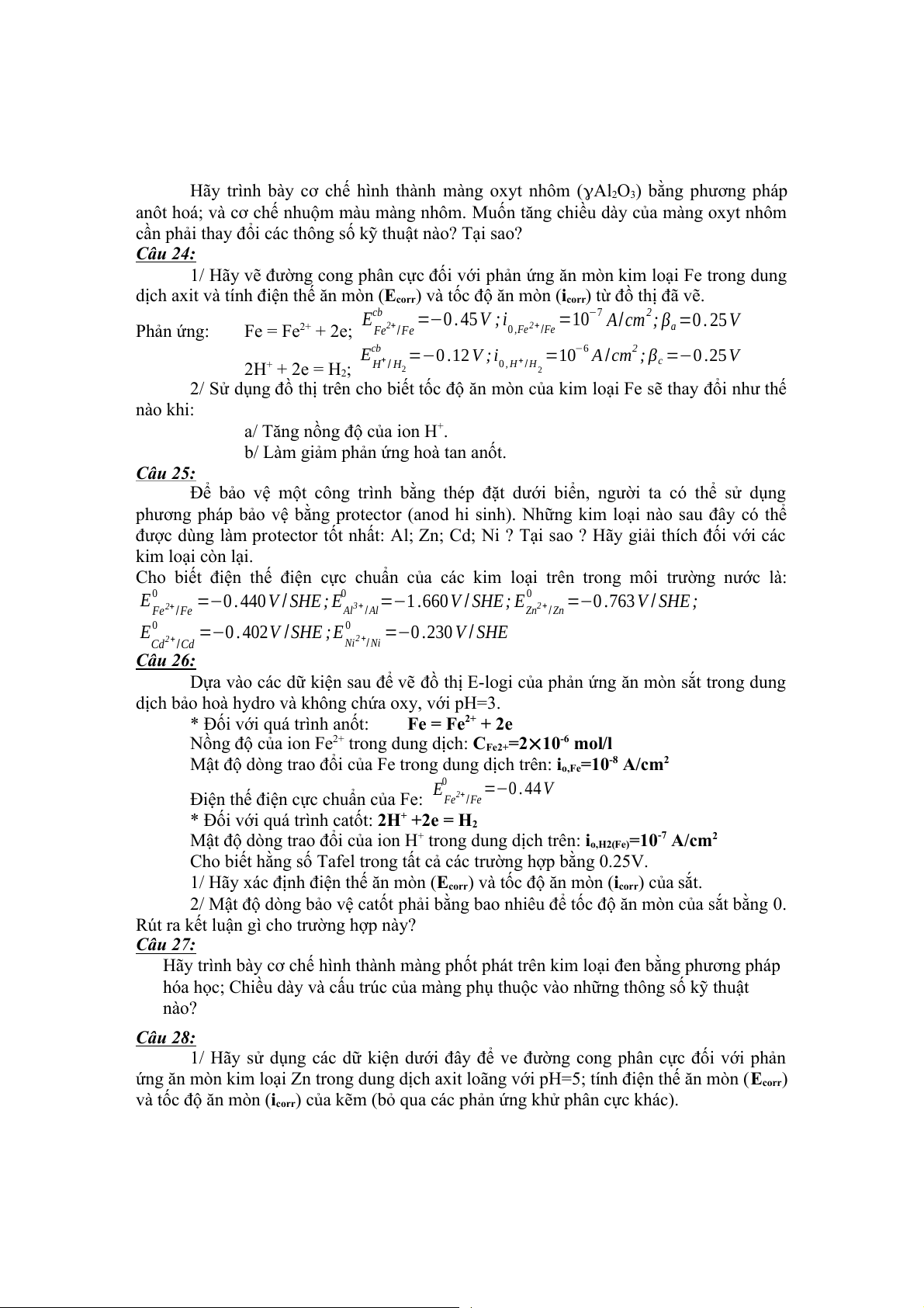 bằng dòng ngoài là không thực tế còn trong môi trường trung tính có oxy hòa tan là rất kinh tế. V A E(V) 4 Eco FeFe2+ + 2e rr 1 2 120mV hình 1a 3 5 E(V) A/cm2 0,1 100 Eco FeFe2+ + 2e rr hình 1c 120mV 2H++2eH2 iađ hình 1b A/cm2 10-6 10-3 10-2 Câu 32: