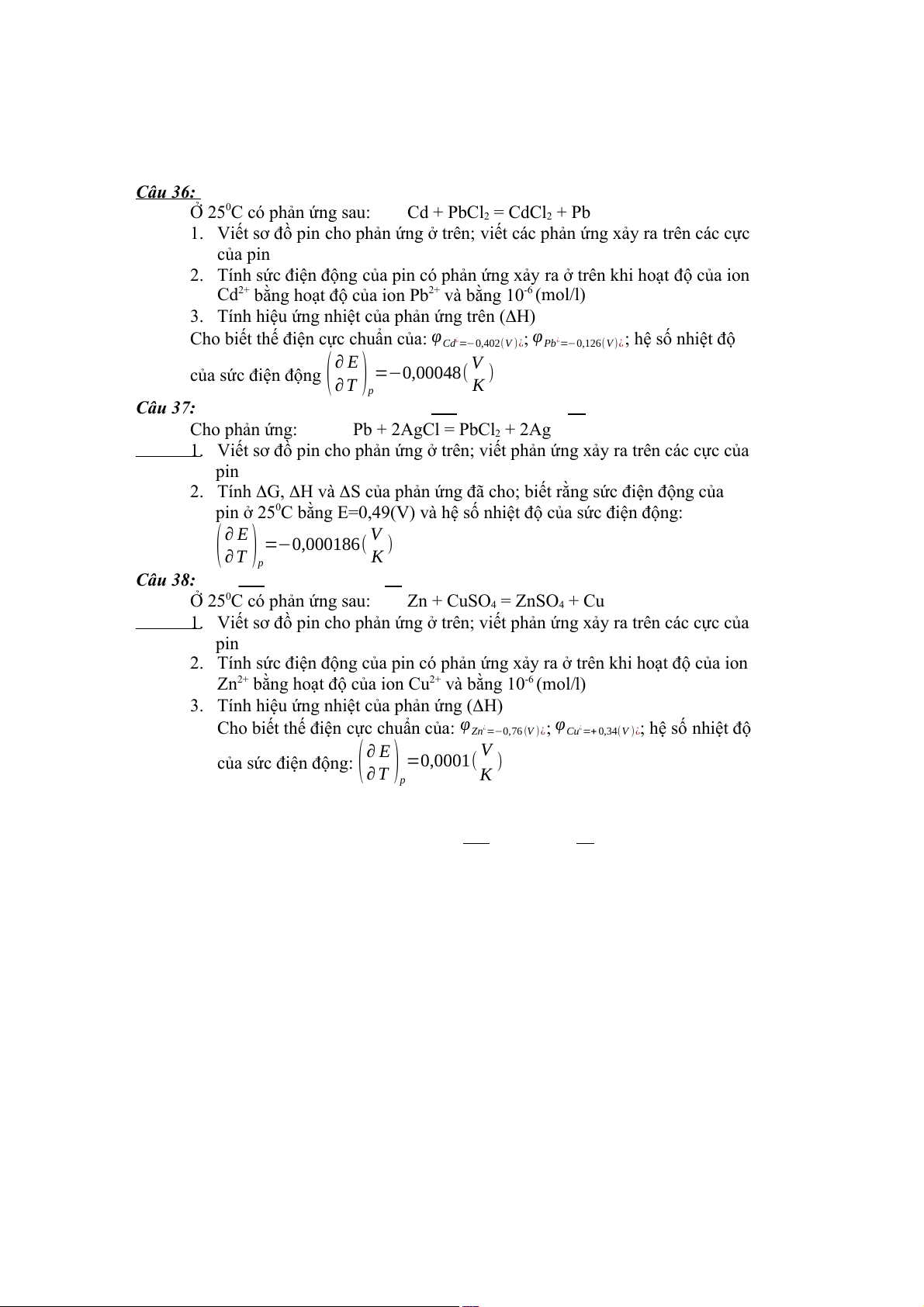 E =0,2699(V ) và E =0,2669(V ) 20 30 Câu 35: Cho sơ đồ pin: (-) Ag,AgClKClbhHg Cl 2 2 ,Hg (+)
