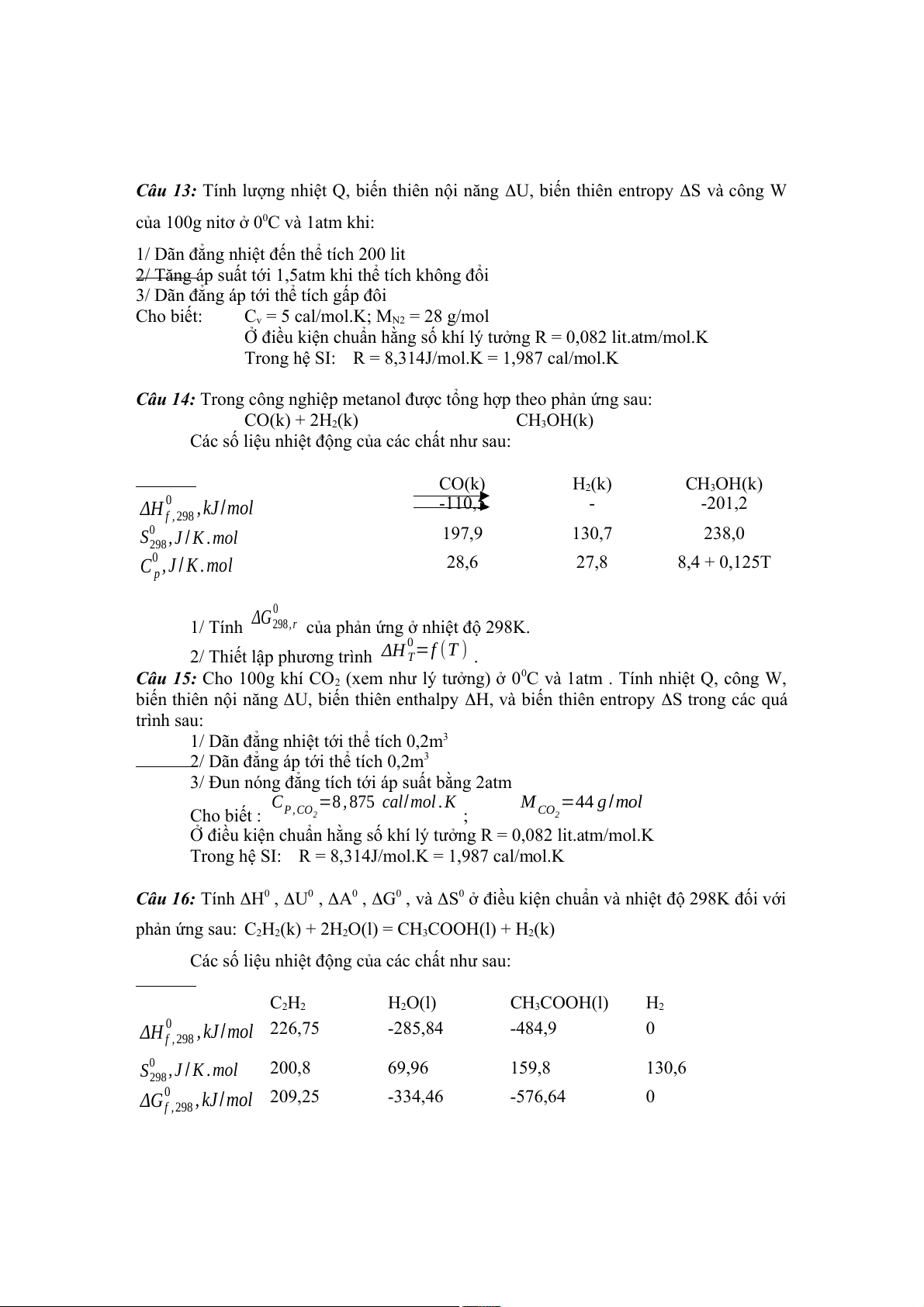 Câu 12: Xác định sự thay đổi enthalpy C), nội năng (U), và entropy (S), khi cho 2,7