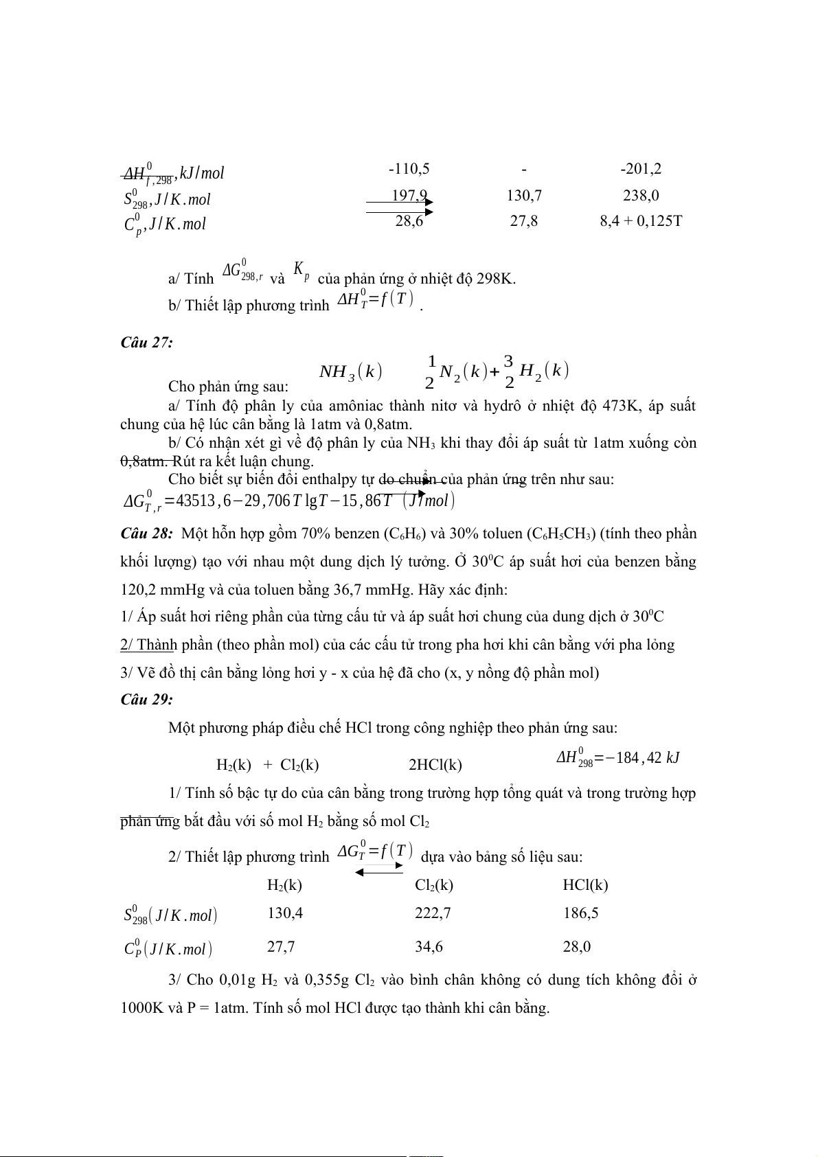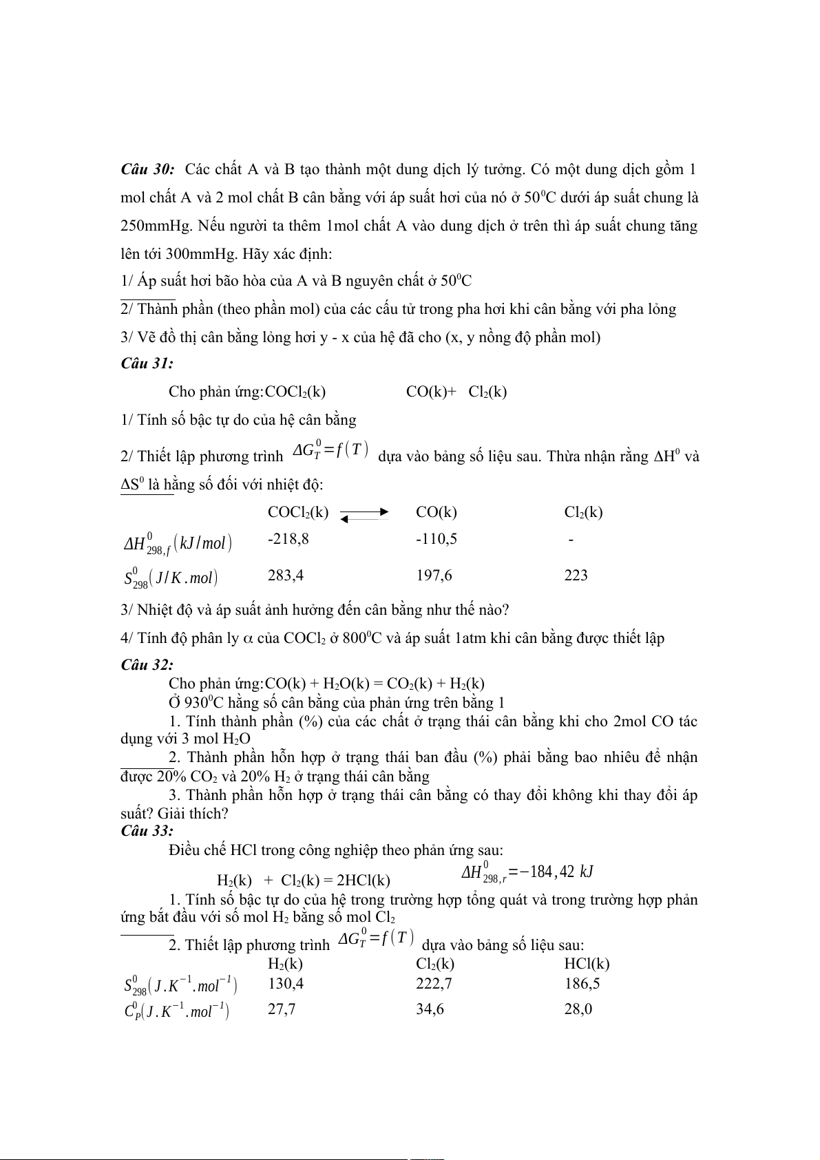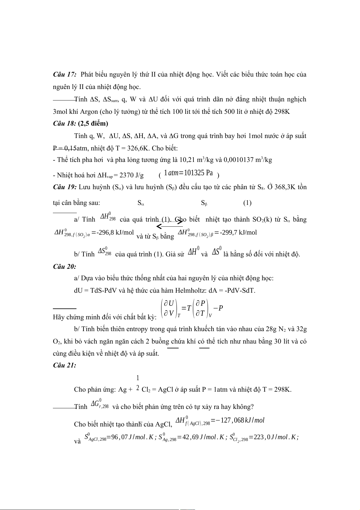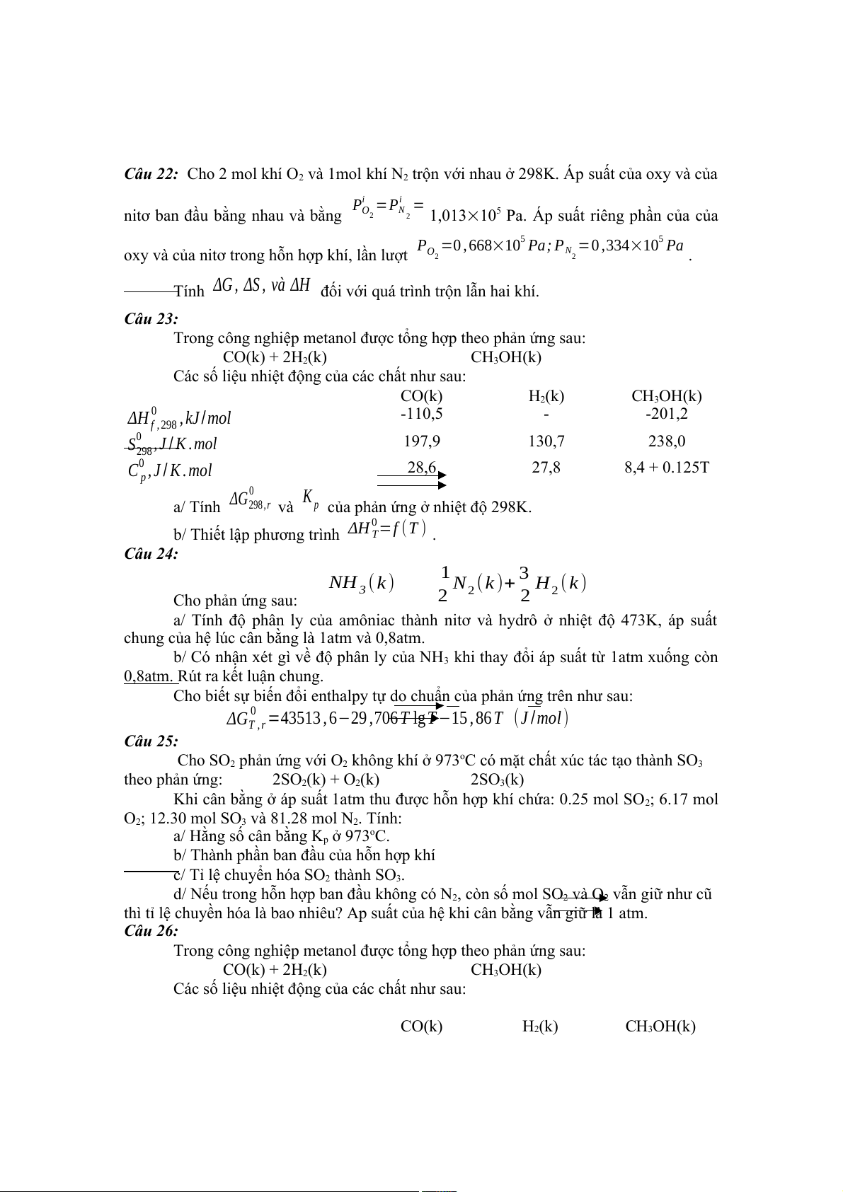 b/ Tính ΔS298 của quá trình (1). Giả sử ΔH 0 và ΔS0 là hằng số đối với nhiệt độ. Câu 20: