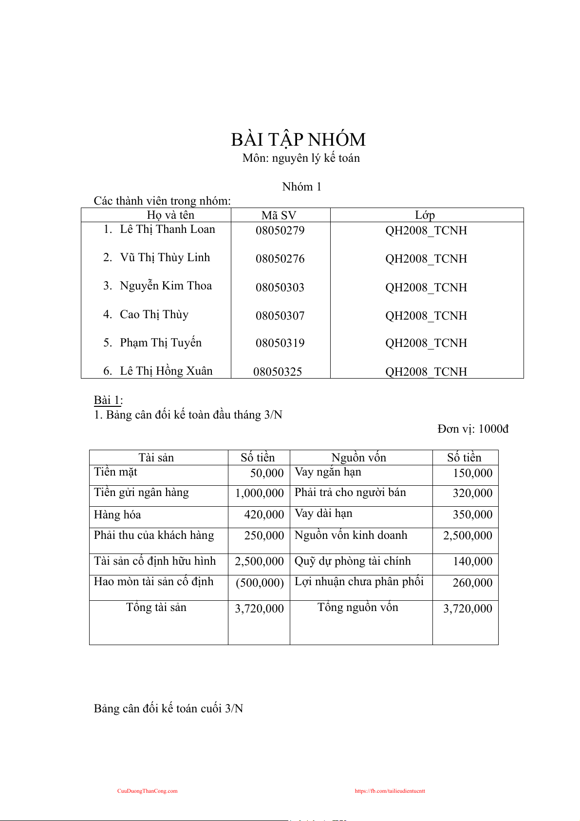 1. Bảng cân đối kế toàn đầu tháng 3/N Đơn vị: 1000đ Tài sản Số tiền Nguồn vốn Số tiền Tiền mặt 50,000 Vay ngắn hạn 150,000 Tiền gửi ngân hàng