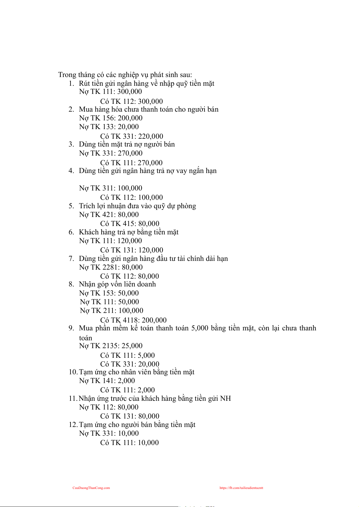 12. Tạm ứng cho người bán bằng tiền mặt Nợ TK 331: 10,000 Có TK 111: 10,000 CuuDuongThanCong.com