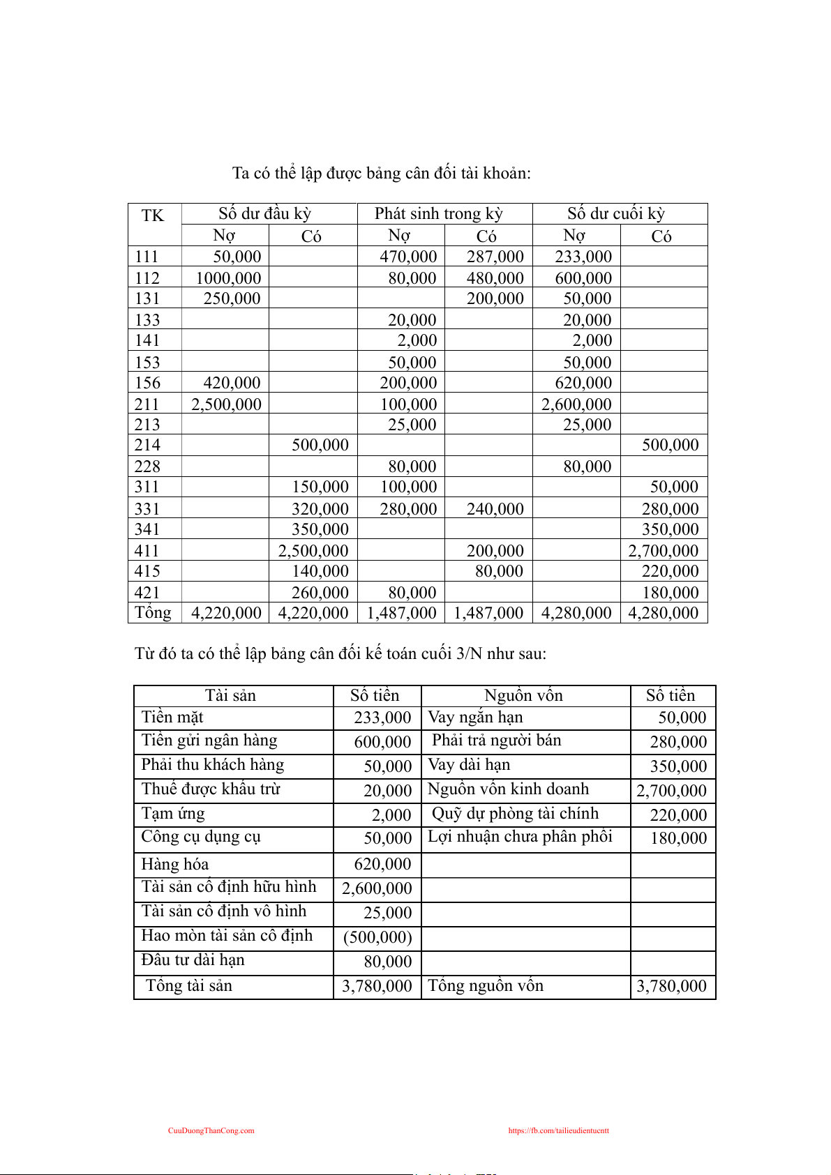 Từ đó ta có thể lập bảng cân đối kế toán cuối 3/N như sau: Tài sản Số tiền Nguồn vốn Số tiền Tiền mặt 233,000 Vay ngắn hạn 50,000 Tiền gửi ngân hàng