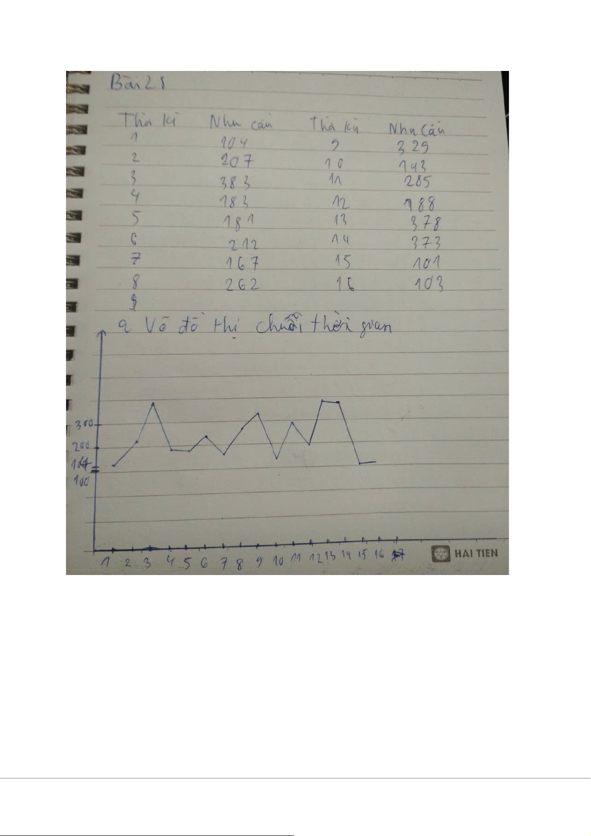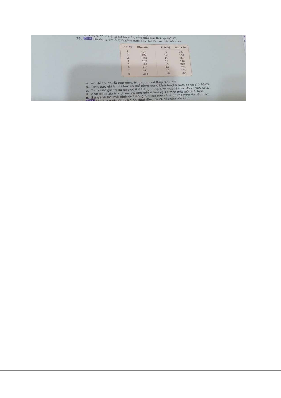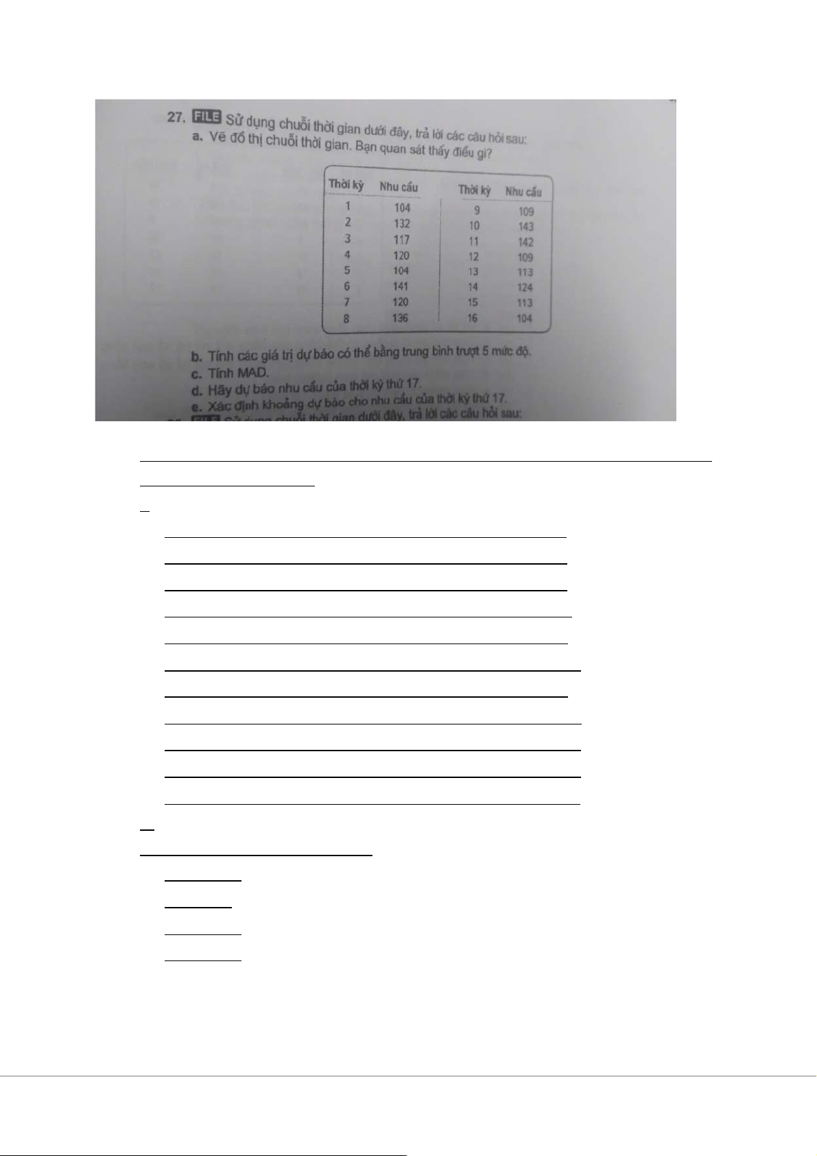 a. Khi vẽ đồ thị, ta thấy nhu cầu biến động không đều, không có xu hướng rõ ràng hoặc tính mùa vụ. b. -Dự báo