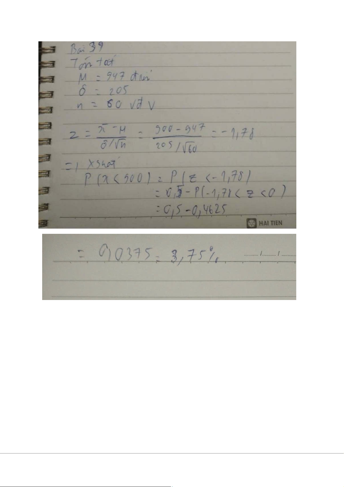 ) tương đương P(Z ≥ 0.59): P(Z ≥ 0.59) = 1 - P(Z < 0.59) = 1 – 0.7224 ≈ 0.2776 Đáp số: 0.2776