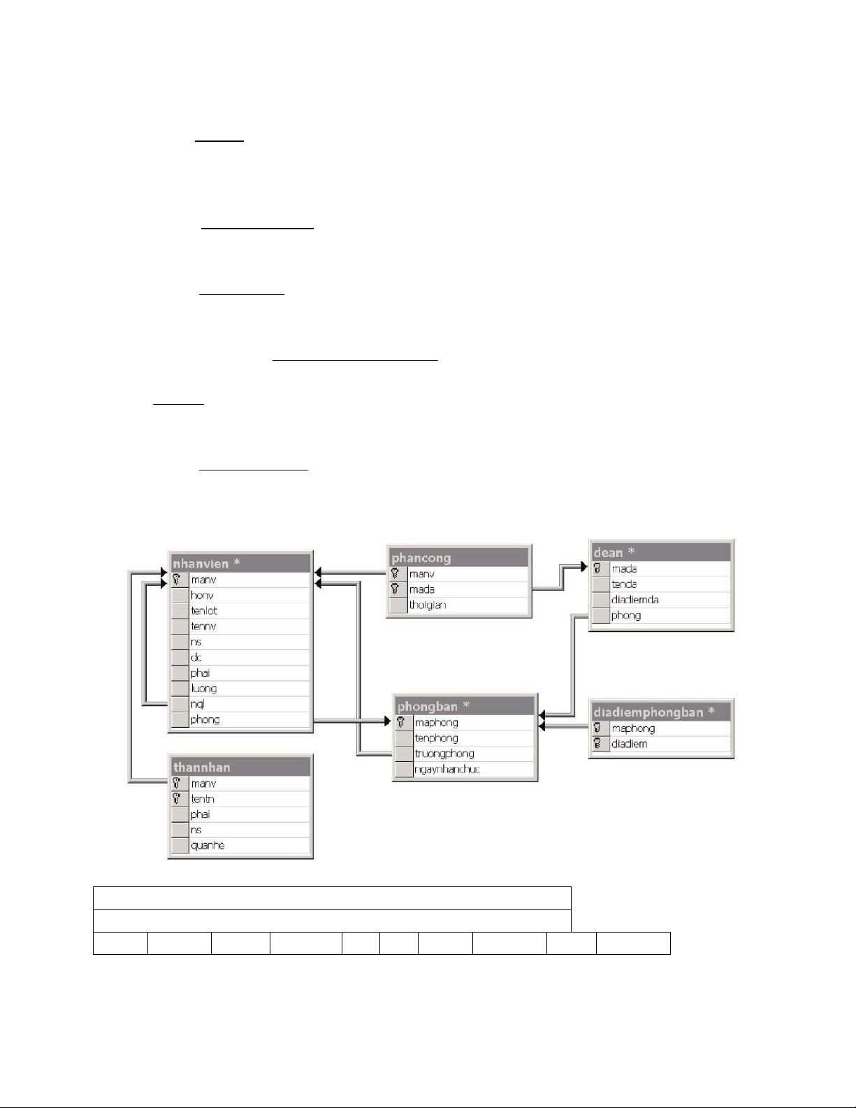MAN HONV TENL TENNV NS DC PHAI LUONG NQL PHONG        lOMoAR cPSD| 47206071     O                731  Tran  Hung  123  Dinh  Ba  Tien  09/01/1975  Nam 30000  333  5  Dao,  Q.1 TP  HCM  638  Nguye  n Van  333  Nguyen Thanh  Tung  08/12/1965 Cu,  Nam 40000  888  5  Q.5 TP  HCM  543  Mai  Thi  453  Tran  Thanh  Tam  31/07/1982 Luu,  Nam 25000  333  5  Q.1  TP  HCM  975  Thong  666  Nguyen Manh  Hung  15/09/1972 Nhat,  Nam 38000  333  5  VUNG  TAU  450    Trung  888  Vuong  Ngoc  Quyen  10/10/1947 Vuong, Nu  55000  1  HA  NOI  291 Ho  Van  Hue,  987  Le  Thi  Nhan  20/06/1951 Q.PN Nu  43000  888  4  TP  HCM  980 Le  Hong  Phong,  777  Tran  Hong  Quang  29/03/1979  Nam 25000  987  4  Q.10  TP  HCM      lOMoAR cPSD| 47206071 999  Bui  Thuy  Vu  19/07/1978 332  Nam 25000  987  4  Nguye  n Thai  Hoc,            Q.1 TP        HCM  PHONGBAN  MAPHON  TRUONGPHON  NGAYNHANCHU  TENPHONG  G  G  C  1  Ban dieu hanh  888  19/06/1971  Mang truyen  3  888  19/06/1971  thong  Thiet ke – Dao  4  777  01/02/2005  tao  5  Phan mem  333  22/05/1995  PHANCONG  MANV MADA THOIGIAN  123  1  32.5  123  2  7.5  333  3  10  333  10  10  333  20  10  453  1  20  453  2  20  666  3  40  888  20    987  20  15  987  30  20  777  10  35  777  30  5  999  30  30  999  10  10  THANNHAN  MANV TENTN PHAI NS  QUANHE  123  Chau  Nu  31/12/1978 Con gai  123  Duy  Nam 01/01/1998 Con trai  123  Phuong Nu  05/05/1977 Vo  333  Duong  Nu  03/05/1967 Vo  333  Khang  Nam 25/10/1968 Con trai  333  Quang  Nu  05/04/1978 Con gai      lOMoAR cPSD| 47206071 987  Dang  Nam 29/02/1950 Chong