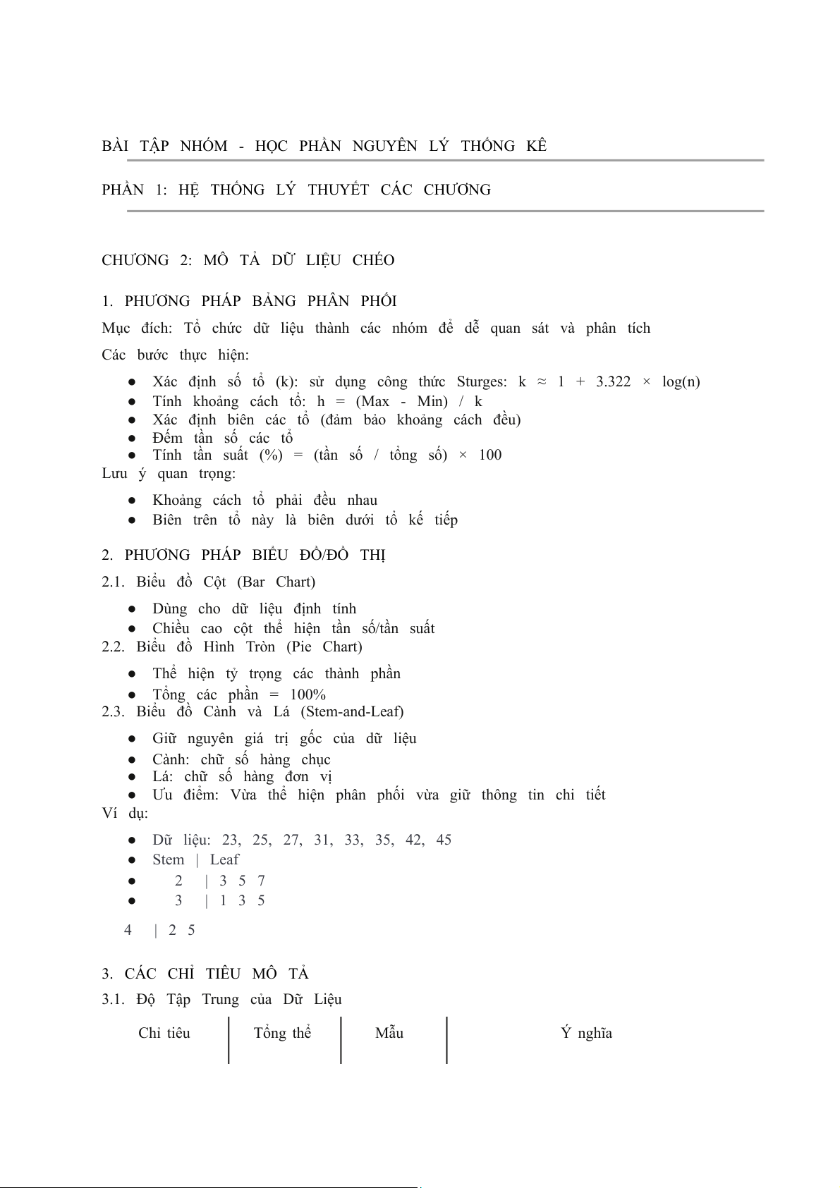 ● Dữ liệu: 23, 25, 27, 31, 33, 35, 42, 45 ● Stem | Leaf ● 2 | 3 5 7 ● 3 | 1 3 5 4 | 2 5 3. CÁC CHỈ TIÊU MÔ TẢ